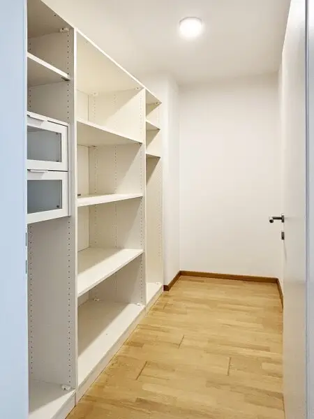 Vom Schlafzimmer wurde ein begehbare Garderobe (Abstellraum) mit etwa 4,1 m2 abgetrennt, die bereits teilweise möbliert ist und sehr viel Stauraum bietet.