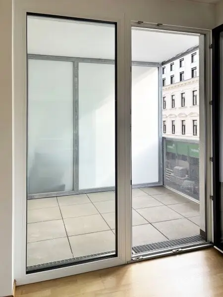 Das Schlafzimmer ist in die gegenüberliegende Richtung (Osten) zum ruhigen Innenhof orientiert und großzügig geschnitten. Es ist etwa 19 m2 groß und bietet ausreichend Platz zum Schlafen und auch einen Arbeitsbereich. Von hier geht es auf den Balkon mit knapp 3,3 m2.