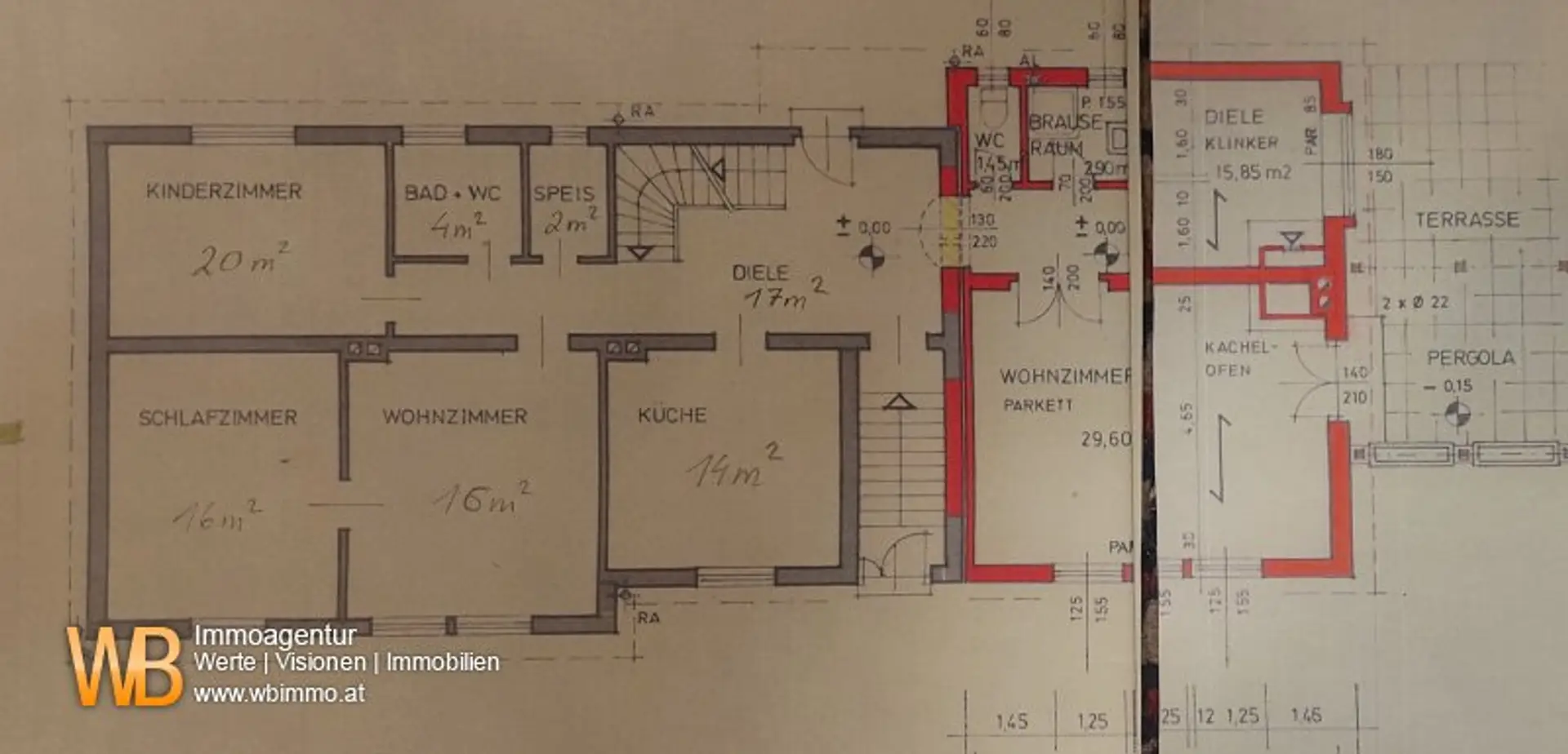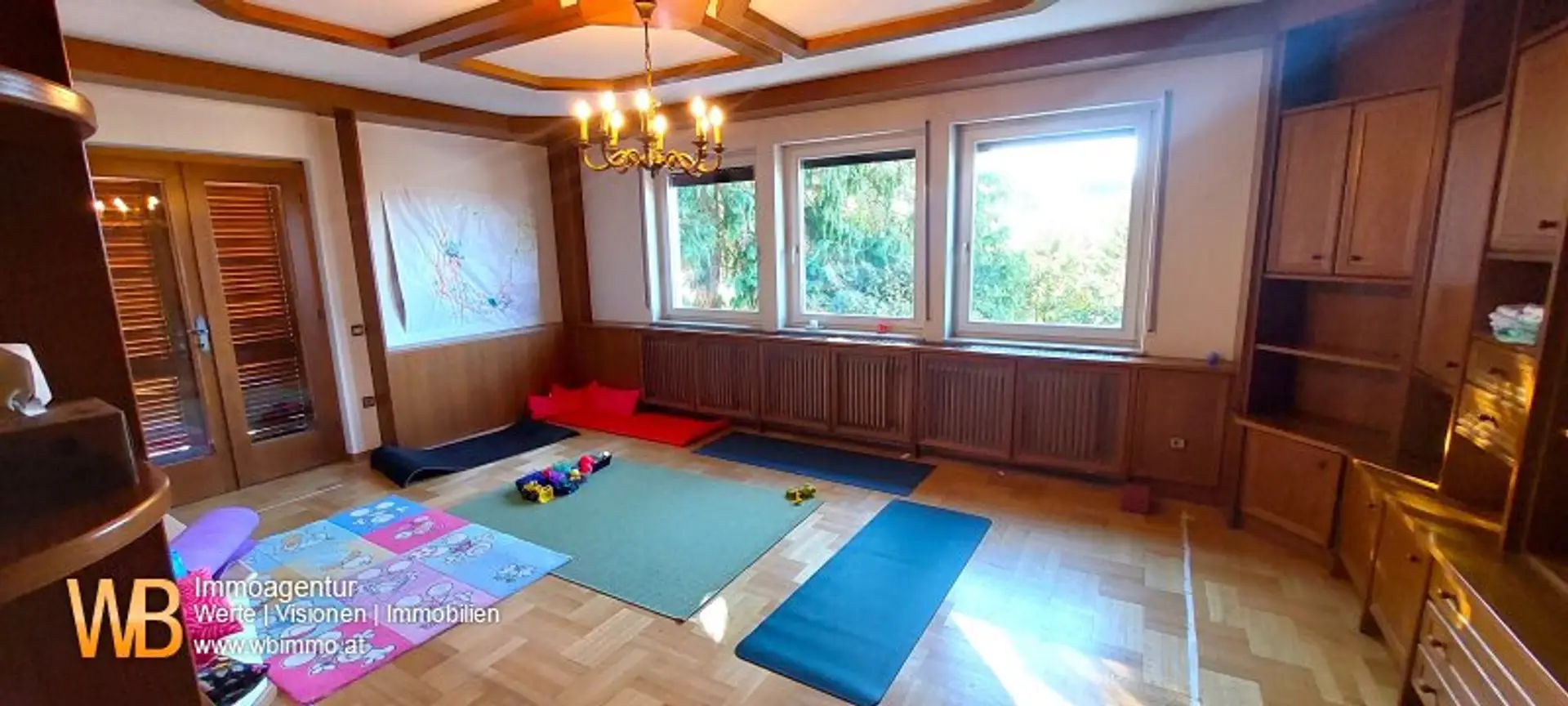 Im Hauptgeschoß gibt es rund 145m² Wohnfläche. Alle Zimmer sind über die einladende Diele mit 17m² zentral begehbar. Das große südostseitige Wohnzimmer (~30m²) befindet sich rechts vom Eingang. Von hier aus gelangt man auch auf die Terrasse und in den Garten. Im WZ gibt es einen gemütlichem Kachelofen, der vom gegenüberliegenden Aufenthaltszimmer und Essbereich (10m²) befeuert wird. Daneben gibt es ein Badezimmer mit Brause und ein WC. Auf der gegenüberliegenden Seite der Diele gibt es im Hauptgeschoß 3 weitere Zimmer mit 20m² und 2 mal ca.16m², die 14m² große Küche, eine Speis und ein weiteres WC. Alle Räume sind hell und freundlich, der Ausblick ist unverbaubar.