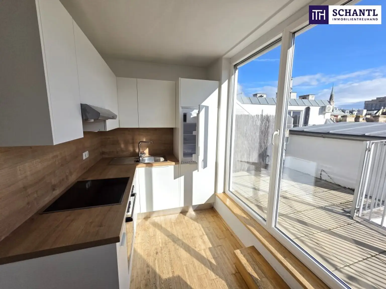 Auf der 2.Ebene finden Sie einen sehr großen, offenen Wohn-Essbereich mit neuer und voll ausgestatteter Einbauküche und Zugang zur hofseitigen Traum-Terrasse mit herrlichem Weitblick!