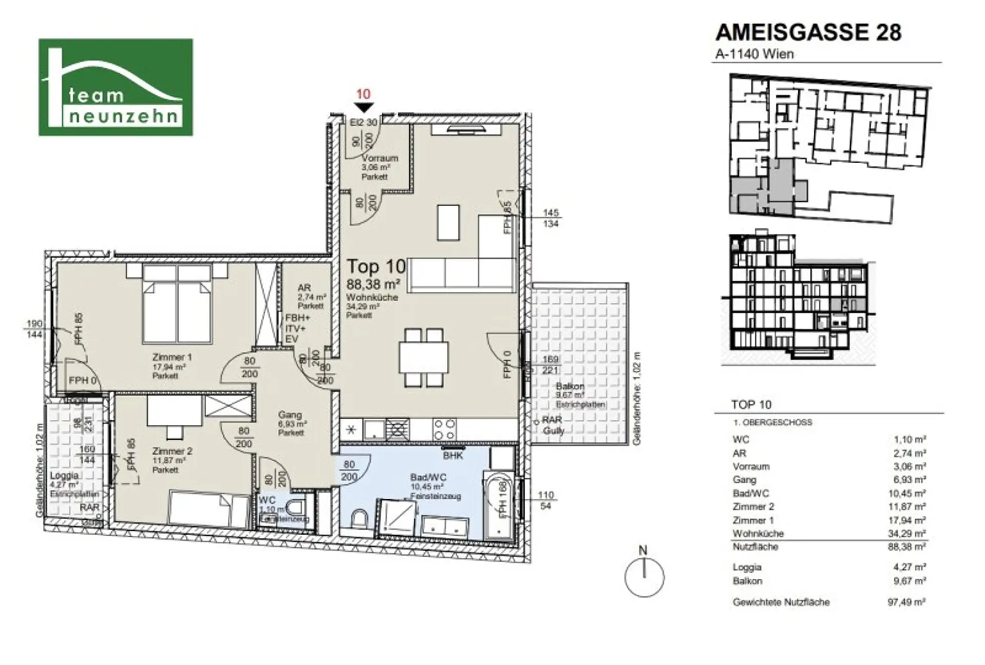 Diese 3-Zimmer-Wohnung mit ca. 88,38 m² Wohnfläche, einem Balkon mit ca. 9,67 m² und einer Loggia mit ca. 4,27 m² liegt im 1. Obergeschoss und gliedert sich in folgende Raumaufteilung: