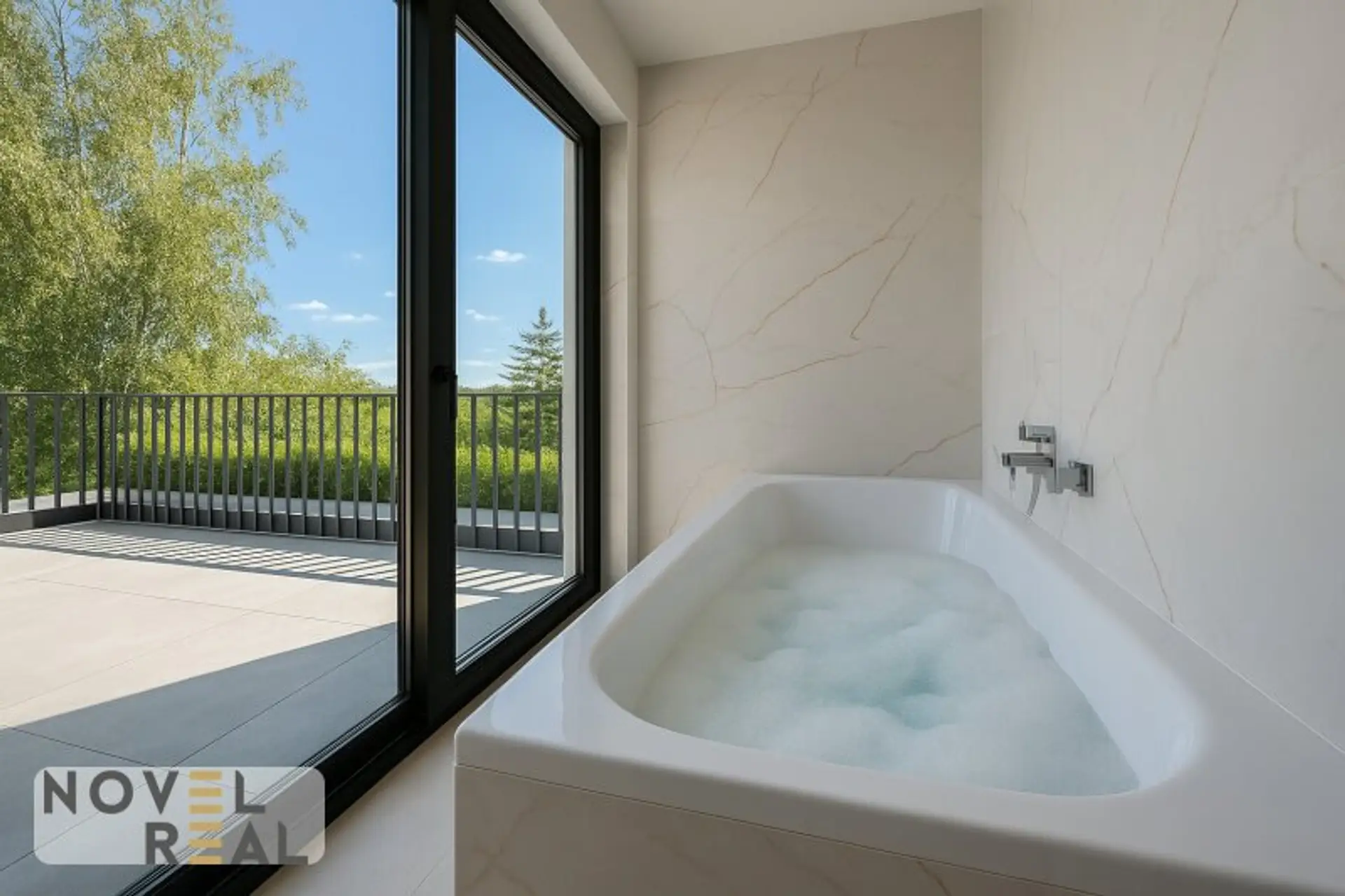 * Badezimmer ausgestattet mit Badewanne, Dusche, Doppelwaschbecken und einer Toilette sowie einem Ausgang auf eine der Terrassen