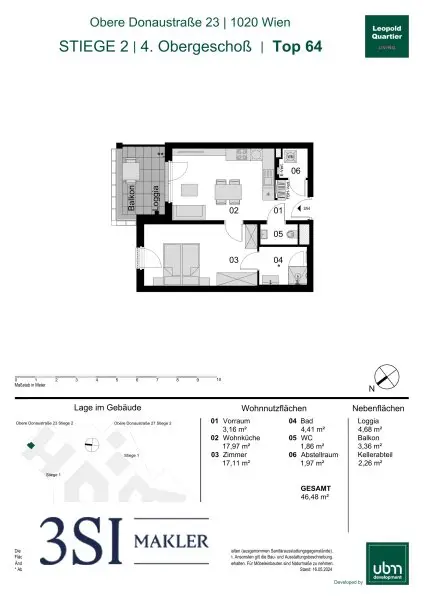 Diese moderne Wohnung befindet sich im 4. Obergeschoß. Die Einheit verfügt über eine Wohnnutzfläche von insgesamt 46,48 m² und bietet zusätzlich eine ca. 4,68 m² Loggia und 3,36 m² großen Balkon.