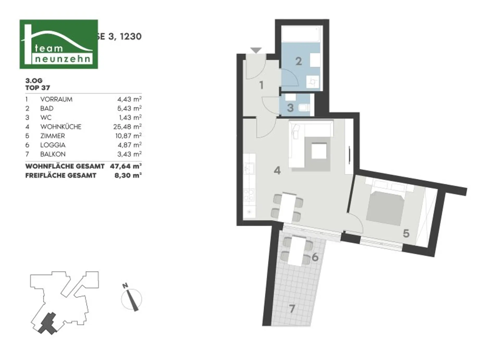 Die Wohnung mit ca. 47,64 m² Wohnfläche mit ca. 4,87 m² Loggia und ca. 3,43 m² Balkon liegt im 3. Obergeschoss und gliedert sich in folgende Raumaufteilung: