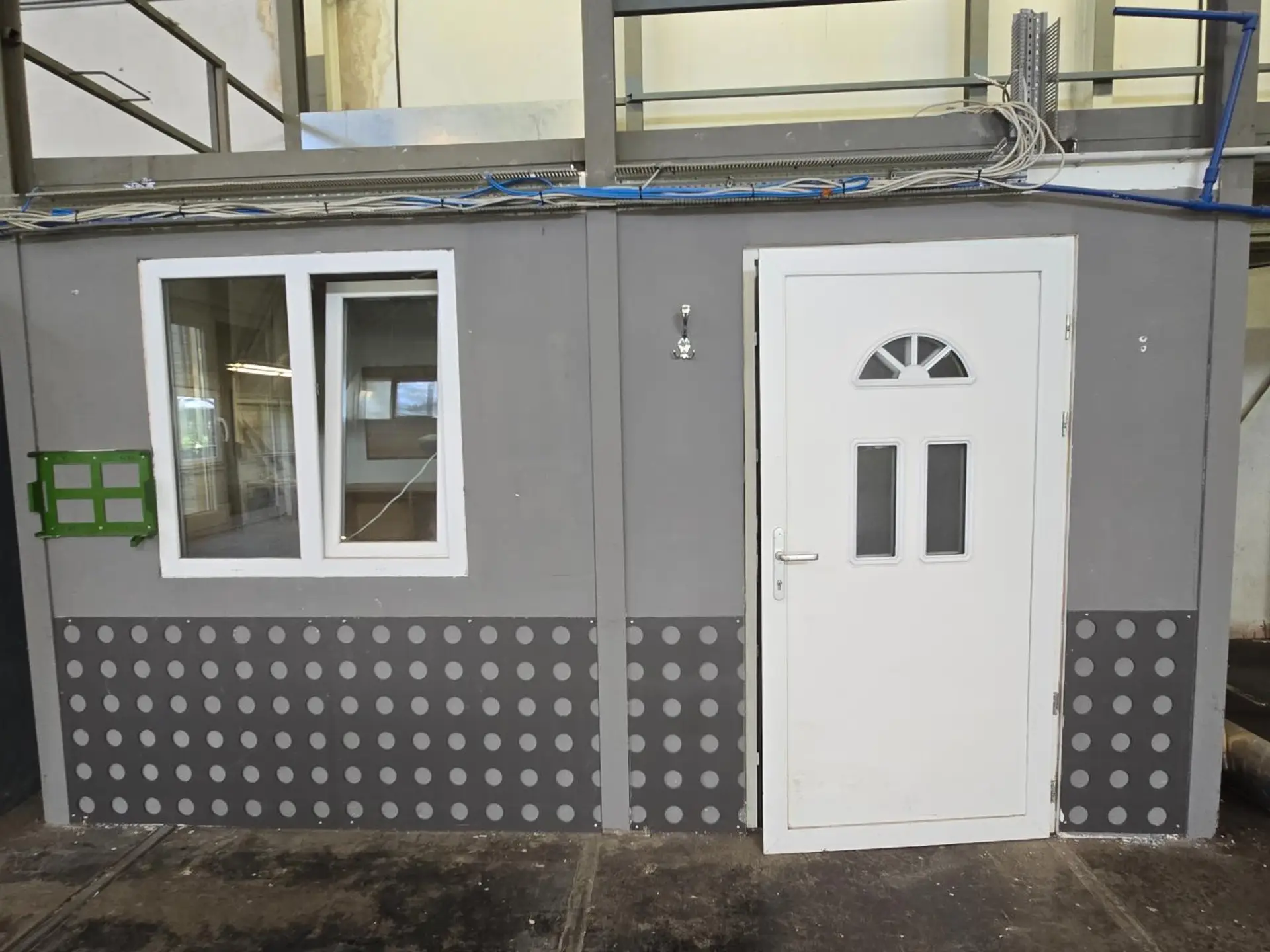 Halle 1: ca. 199 m², ca. 18,8 x 10,6 m, ausgestattet mit 5 Kragarmregalen, zusätzlich ca. 75 m² Plattform aus Stahlgitterrosten im 1. Stock, ca. 10,6 x 7,1 m, über Metallstiege zugänglich, Bürocontainer.