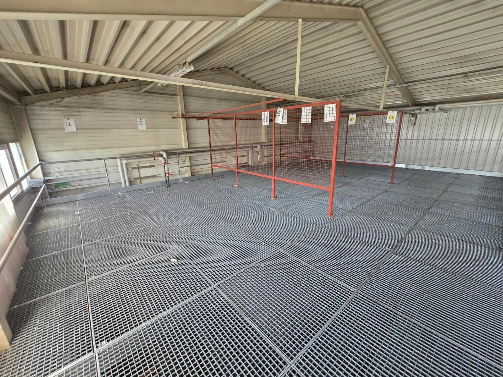 Halle 6: ca. 258 m², ca. 16,4 x 15,7 m, 2 Dachflächenfenster, 2 durchgehende Fensterbänder an der Außenwand, 2 Heizlüfter, ca. 20 m² Plattform aus Stahlgitterrosten im 1. Stock, ca. 5 x 4 m, über Metallstiege zugänglich.