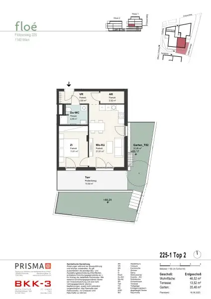 Die freundliche Top 02 befindet sich in Haus 1 und überzeugt durch ihren intelligent geplanten Grundriss sowie eine lichtreiche Süd-/Ost-Ausrichtung. Sowohl der helle Wohn- und Essbereich als auch das Schlafzimmer öffnen sich zur südseitigen Terrasse und zum privaten Garten – ein gefragtes Merkmal, das nachhaltig zur Vermietbarkeit beiträgt.
