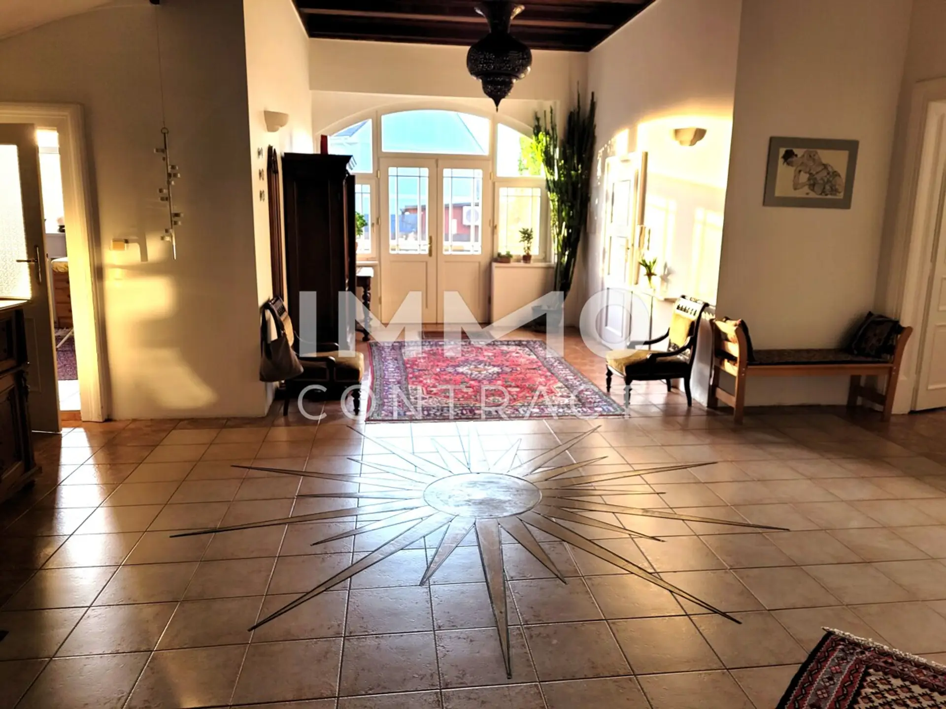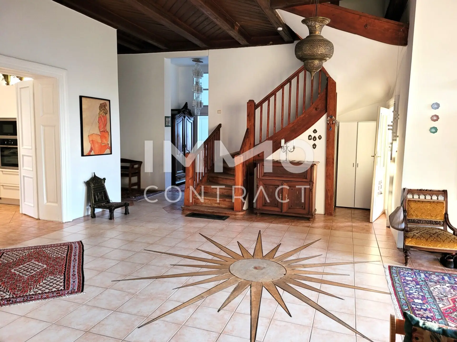Bereits das einladende Entrée vermittelt den einzigartigen Charme dieser Immobilie. Der über 75 m² große Wohnsalon besticht durch seine hohen Holzdecken, große, fast bodentiefe Fenster mit Blick auf den Park und einen stilvollen offenen Kamin, der für eine warme und gemütliche Atmosphäre sorgt.