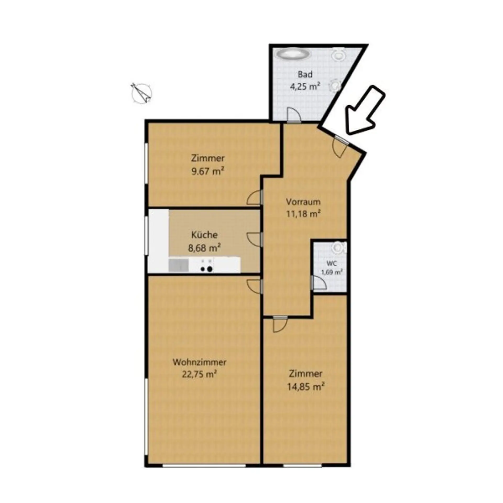 Alle drei Zimmer sind zentral begehbar, was flexible Gestaltungsmöglichkeiten bietet. Die separate Küche ist mit allen Geräten ausgestattet (Cerankochfeld, Backrohr, Dunstabzug, Kühl-Gefrierkombination). Das Badezimmer verfügt über eine Badewanne und ein WC, zusätzlich gibt es ein zweites, separates WC mit Handwaschbecken.