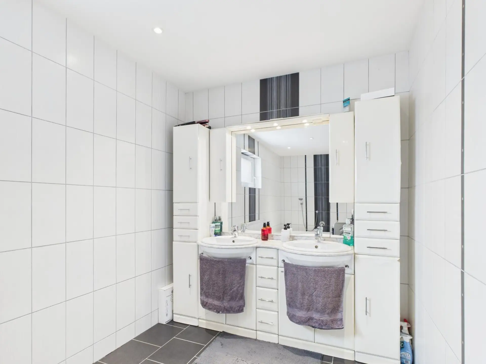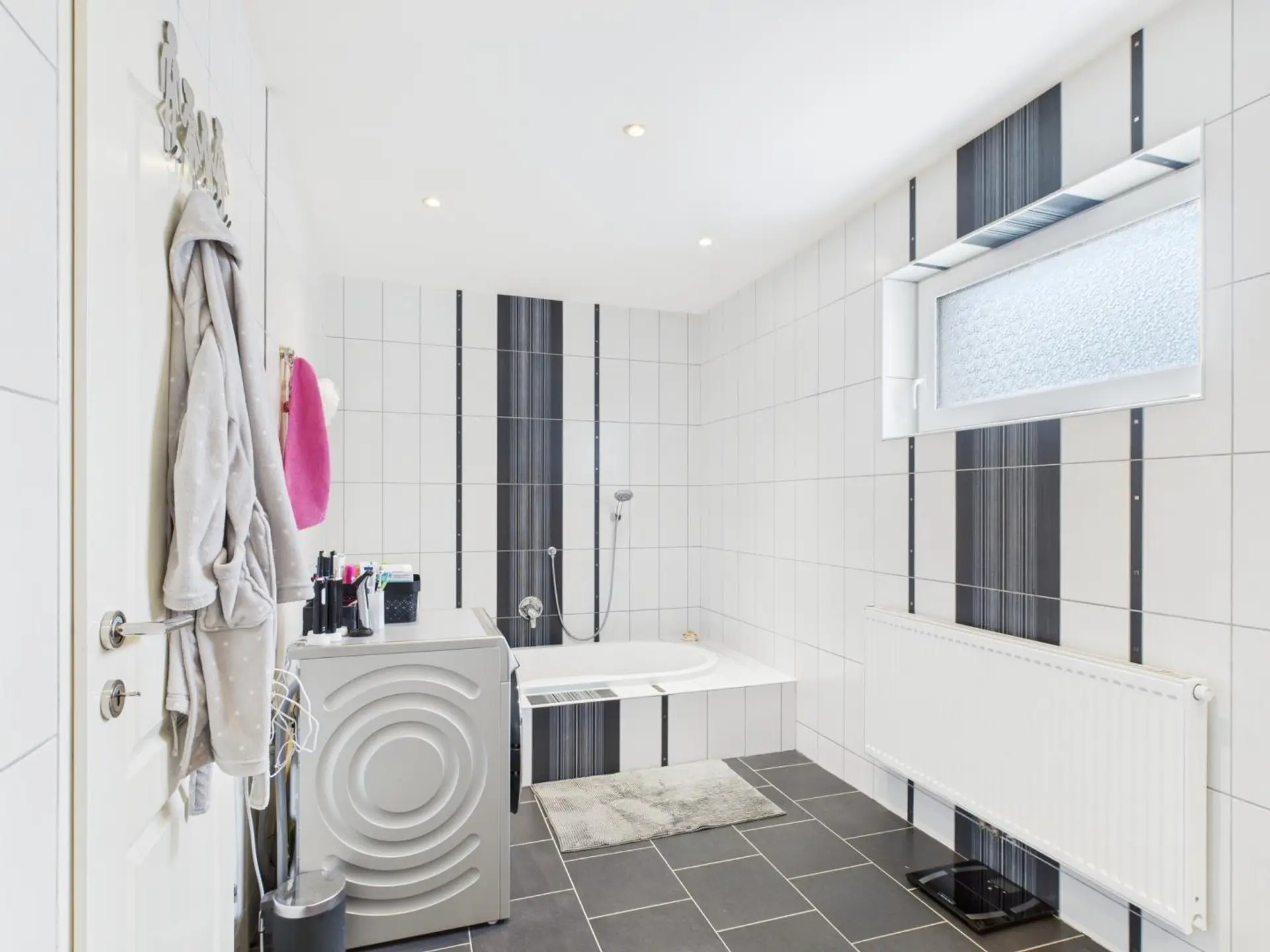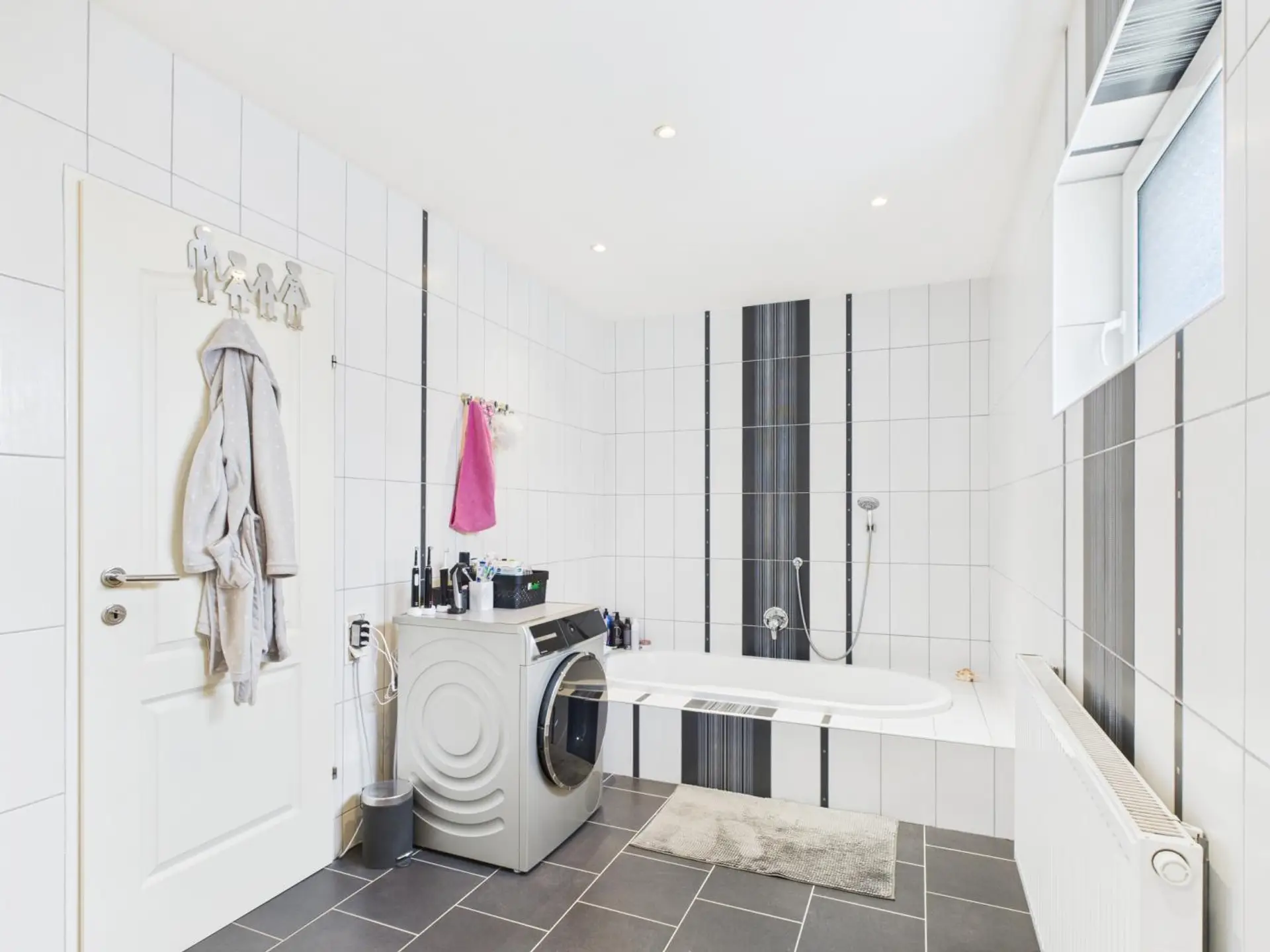 • großzügiges Badezimmer mit Badewanne, Doppelwaschbecken, Waschmaschinenanschluss und Fenster