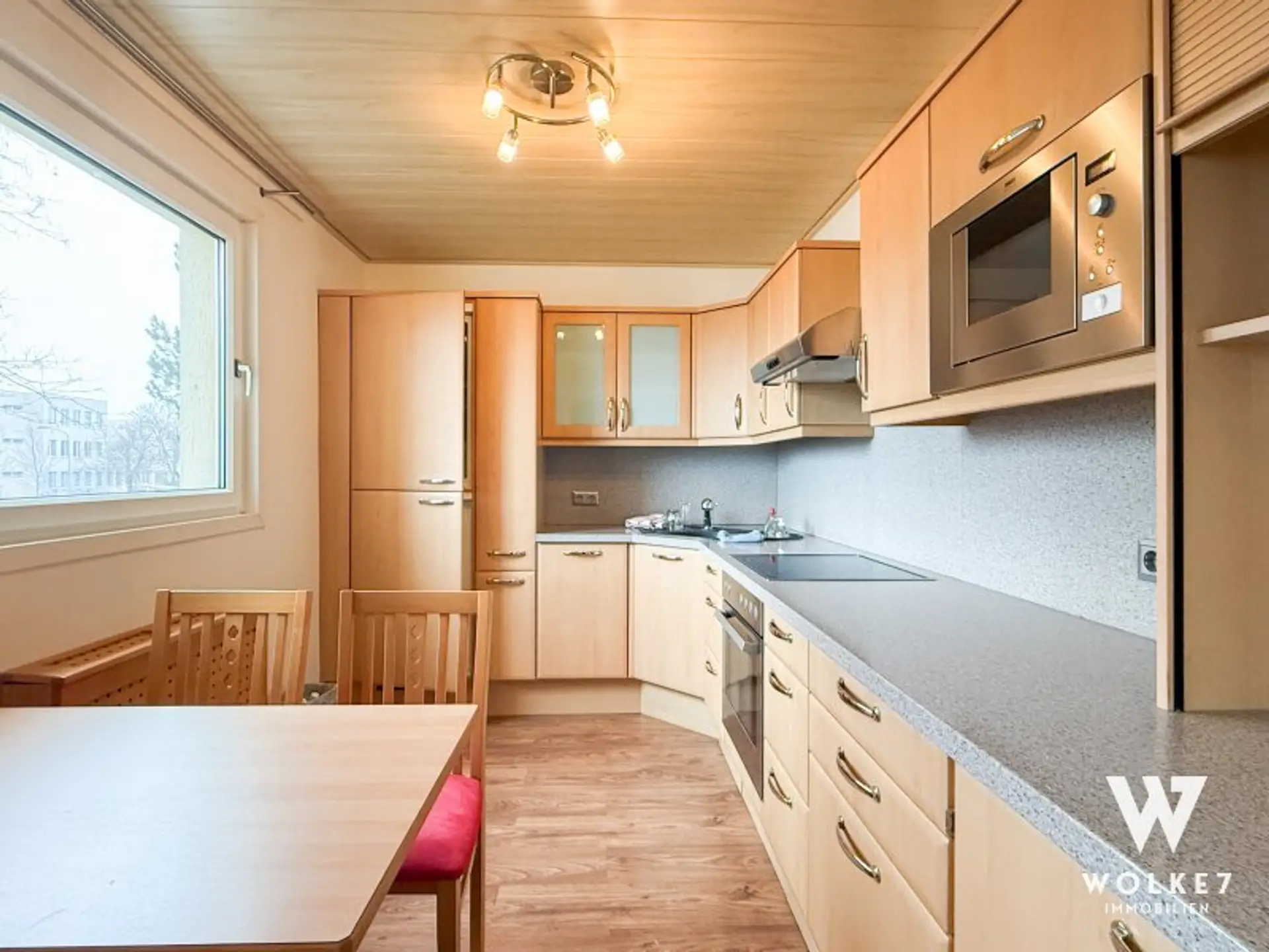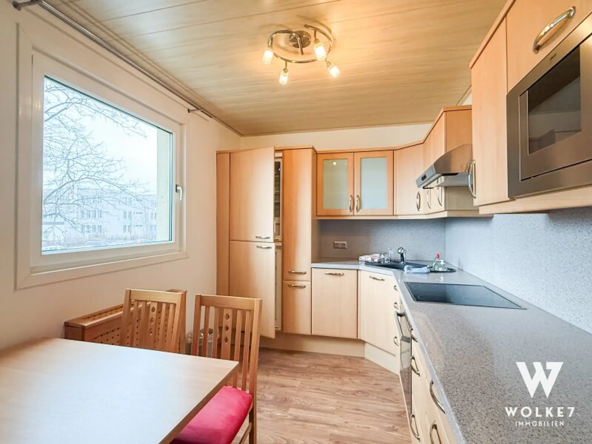 Der helle Wohnbereich mit DAN-Einbauküche inklusive Geräten bildet das Herzstück der Wohnung. Ein besonderes Highlight ist die verbaute Loggia, die sich flexibel nutzen lässt – beispielsweise als Arbeitszimmer, Wintergarten oder zusätzlicher Schlafbereich.