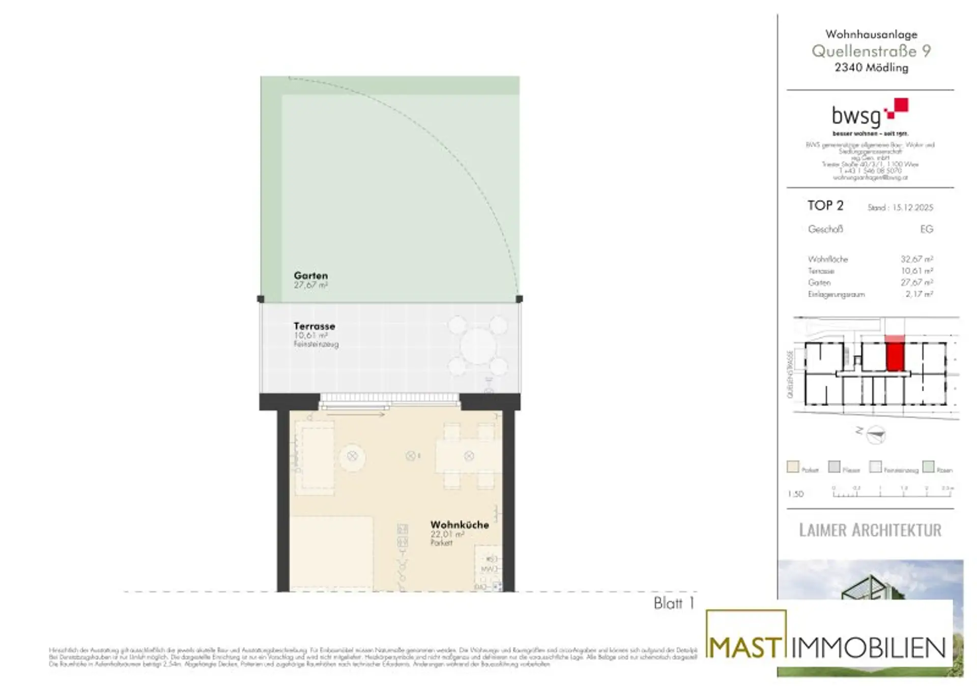 Die Wohnung befindet sich im Erdgeschoss und verfügt über 32,67 m² Wohnfläche + eine 10,61 m² große Terrasse und einen 27,67 m² großen Garten.