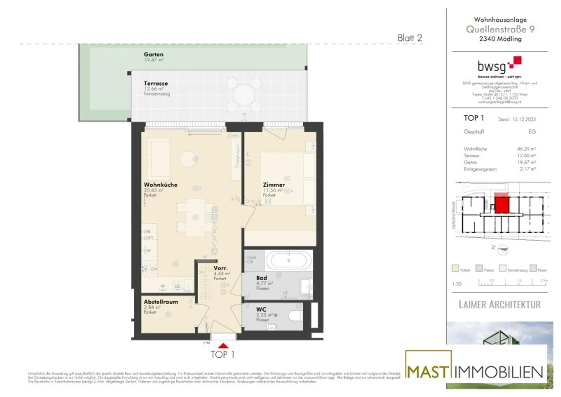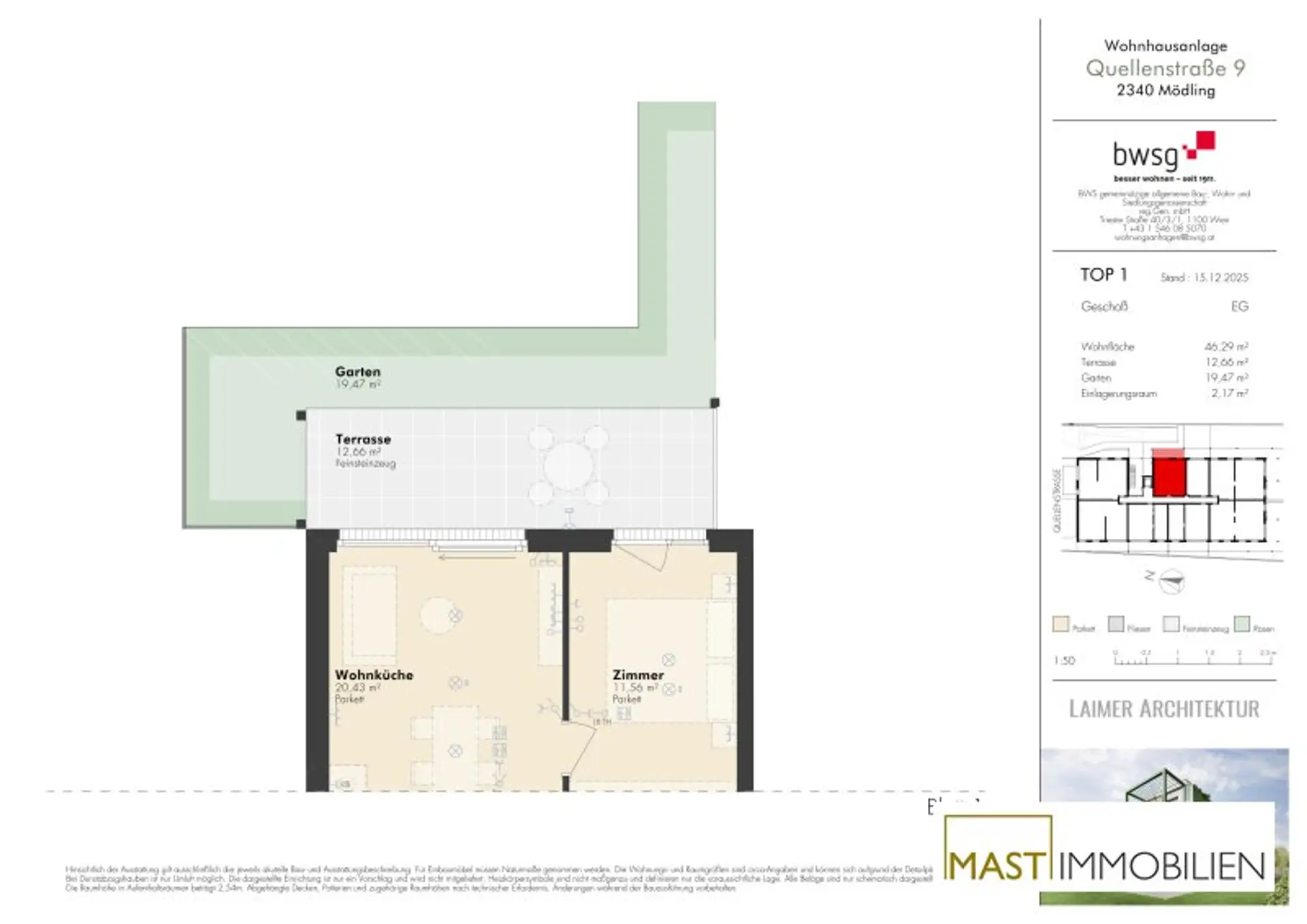 Die Wohnung befindet sich im Erdgeschoss und verfügt über 46,29 m² Wohnfläche + eine 12,66 m² große Terrasse und einen 19,47 m² großen Garten.