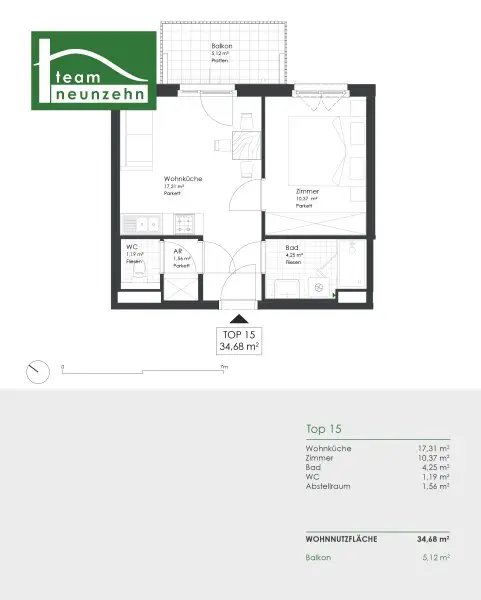 Die Wohnung mit ca. 34,68 m² Wohnfläche und ca. 5,10 m² Balkon befindet sich im 2. Obergeschoss und hat folgende Raumaufteilung: