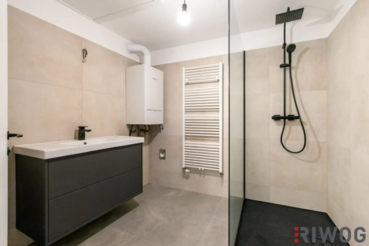 * geräumiges Badezimmer mit Regendusche, Waschbecken (mit Unterschrank), Handtuchheizkörper und Waschmaschinenanschluss