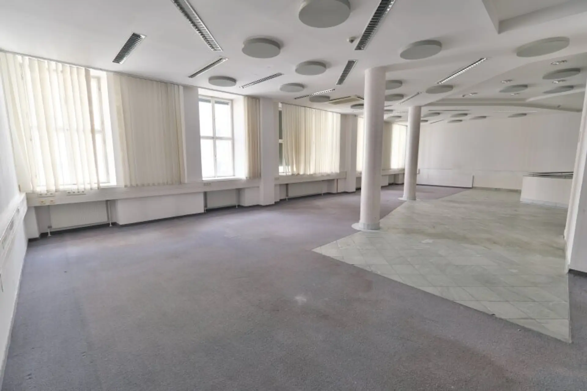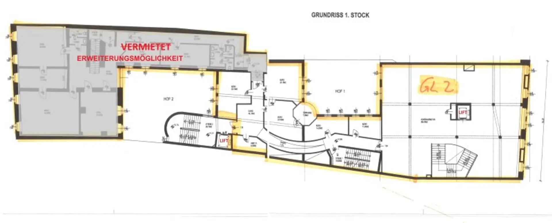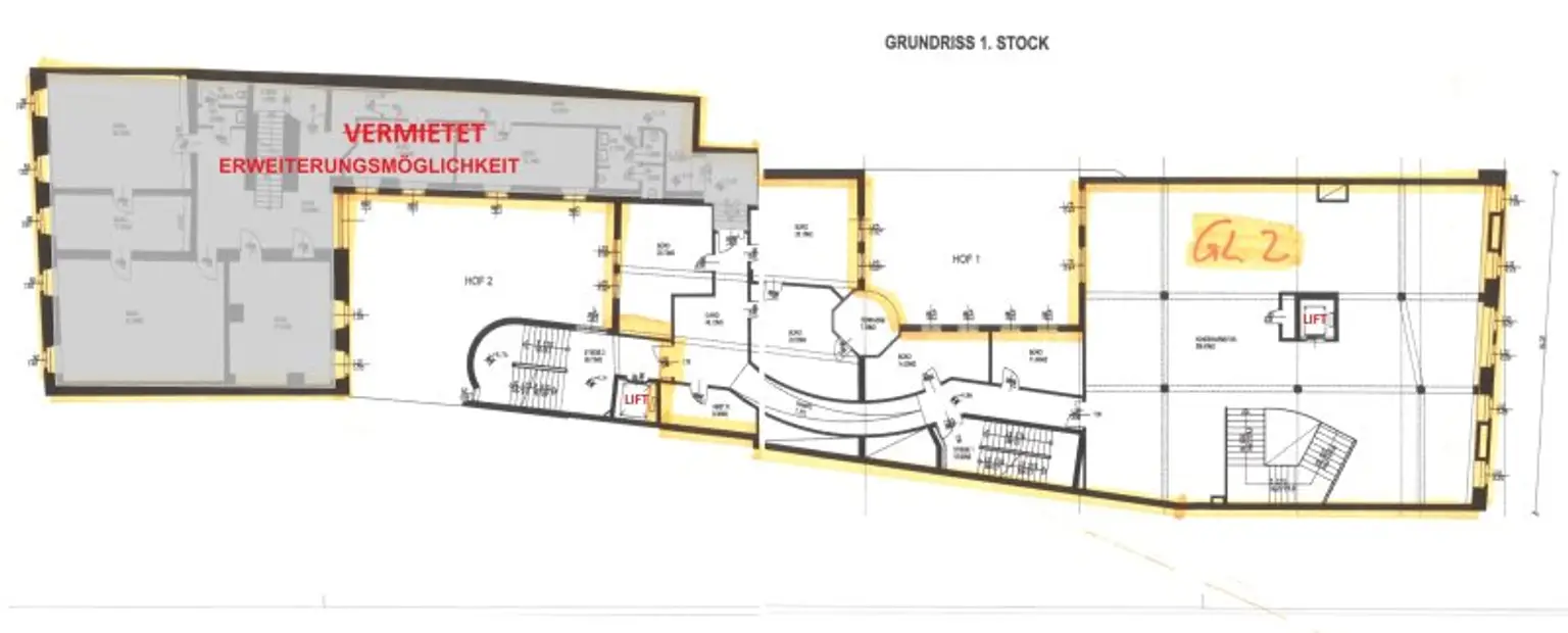 Sodann kommt man wahlweise über die eigene Stiege oder den eigenen Lift in den 1. Stock und befindet sich in einem Saal mit 256 m². An diesen angeschlossen sind weitere 6 Räume. Der Mieter bekommt nahezu jede Zustimmung Umbauten oder andere Veränderungen durchzuführen. Erweiterungsmöglichkeiten, falls man mehr m² braucht, gibt es genug. Gleich angrenzend im EG noch ein ehemaliges Gastrolokal mit 115 m². Auch Lagerräume im Keller gibt es. Sogar ein Tresorraum stünde zur Verfügung.