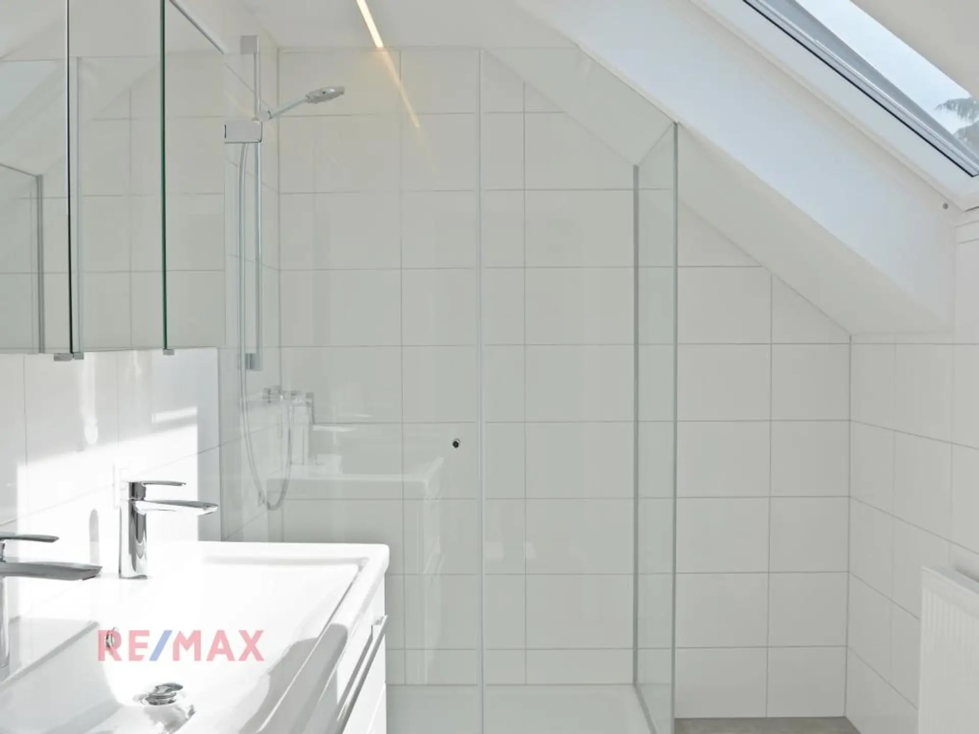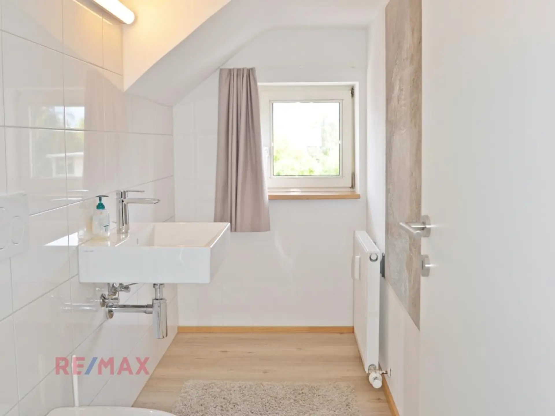 Bad mit Dusche, WC, Handtücher, Haarfön