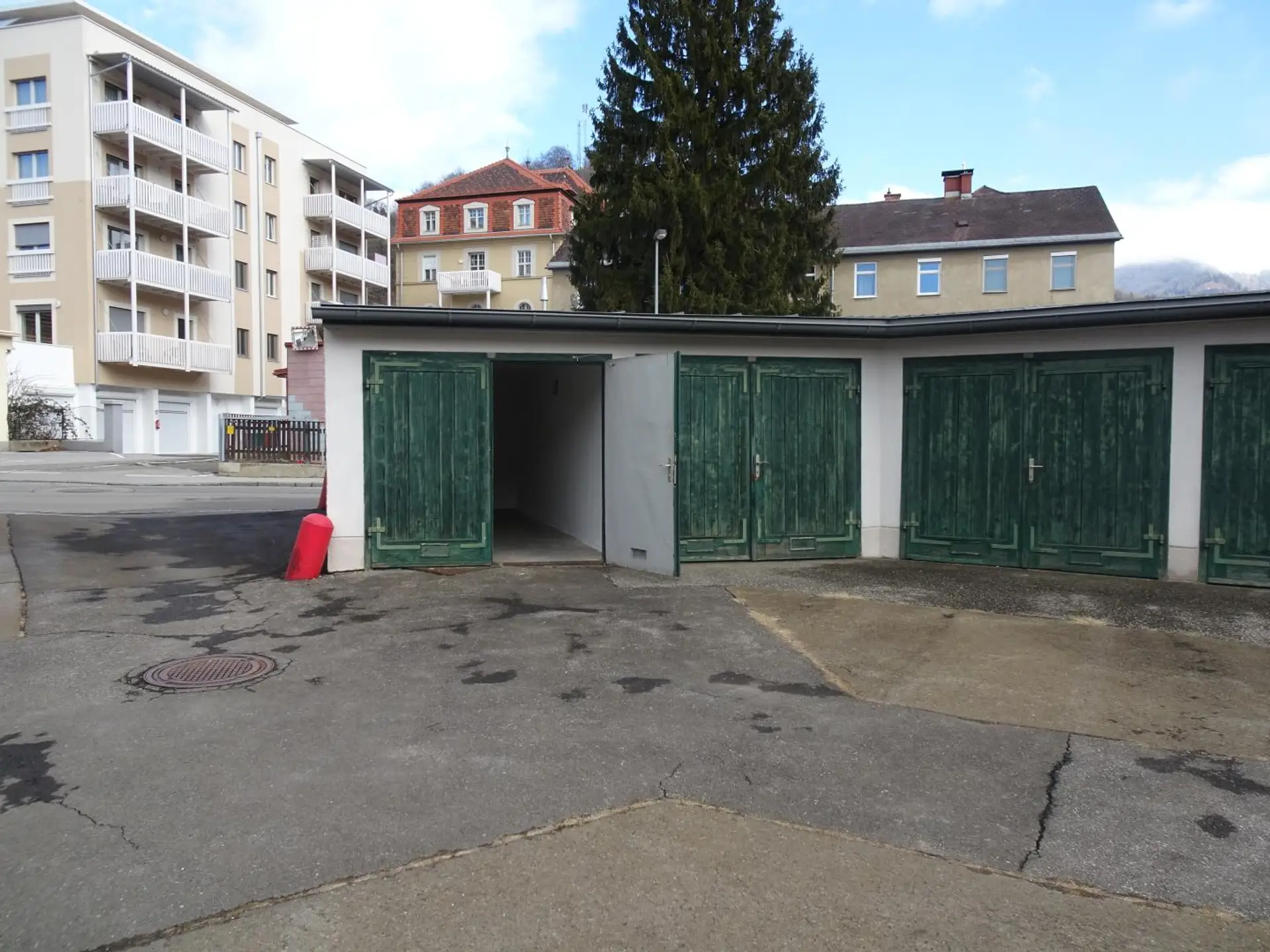 Auf der Liegenschaft Pischker Straße 16, 8600 Bruck an der Mur befindet sich ein Mehrparteienhaus und im Innenhof sind Garagen vorhanden.