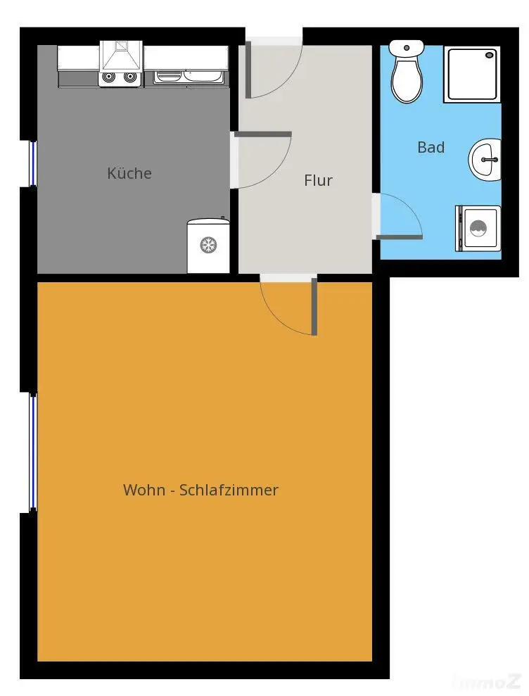 Vorraum, Wohn-Schlafraum, Küche möbliert mit einem Küchenblock und Platz für einen kleinen Essbereich. Badezimmer mit Dusche und WC und Platz für eine schmale Waschmaschine, Kellerabteil. Alle Räume sind separiert begehbar. Ein Telefonanschluss ist gegeben. Die Heizkosten sind inkl. Warmwasser. Ein Büroaufwand in der Höhe von 1 x Euro 160,- ist an die Hausverwaltung zu bezahlen.