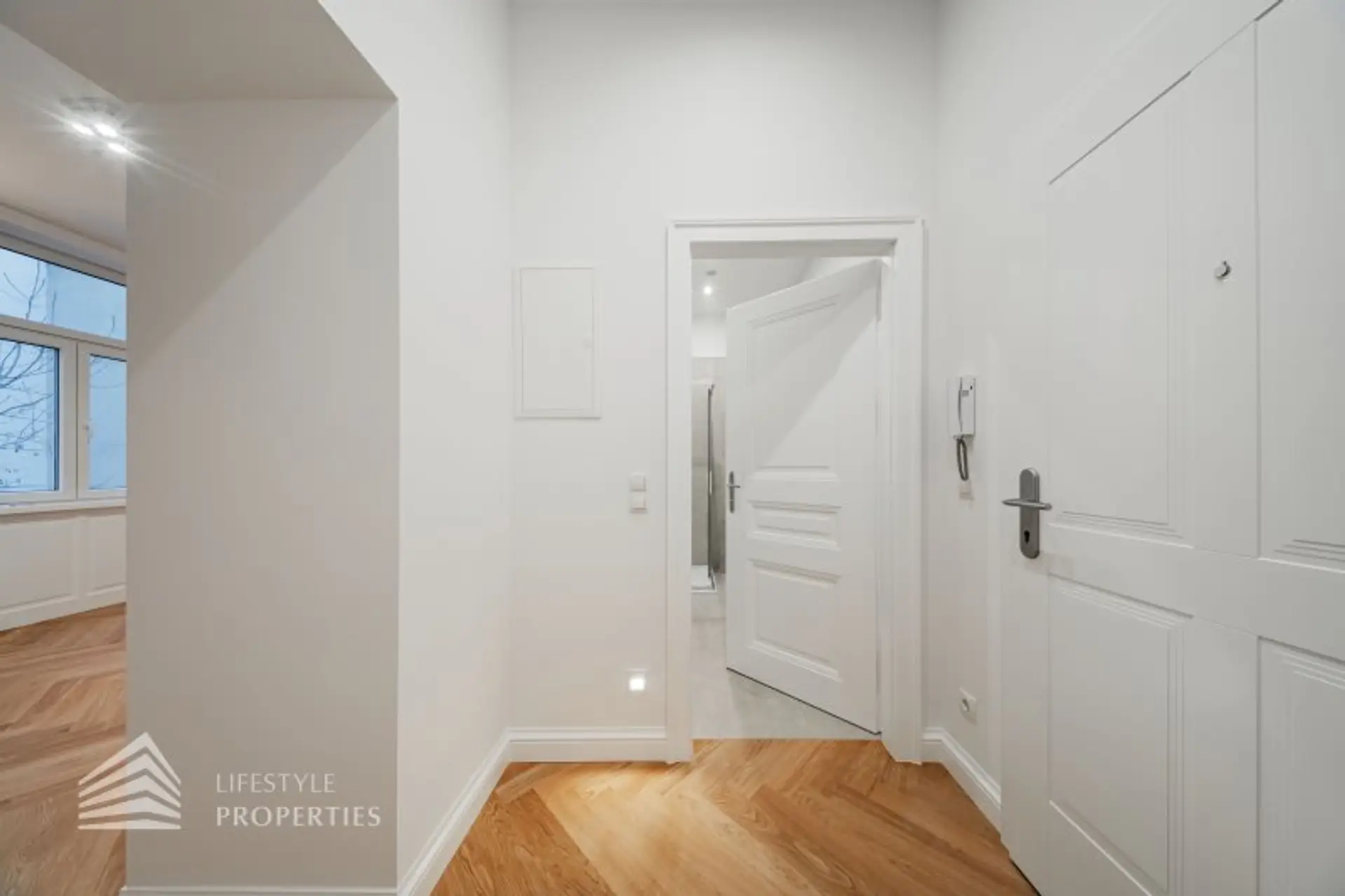 Sie betreten die Wohnung und befinden sich im Vorraum, rechts befindet sich das Badezimmer mit Dusche, Handwaschbecken, WC und Waschmaschinenanschluss, geradeaus befindet sich der Wohnbereich.