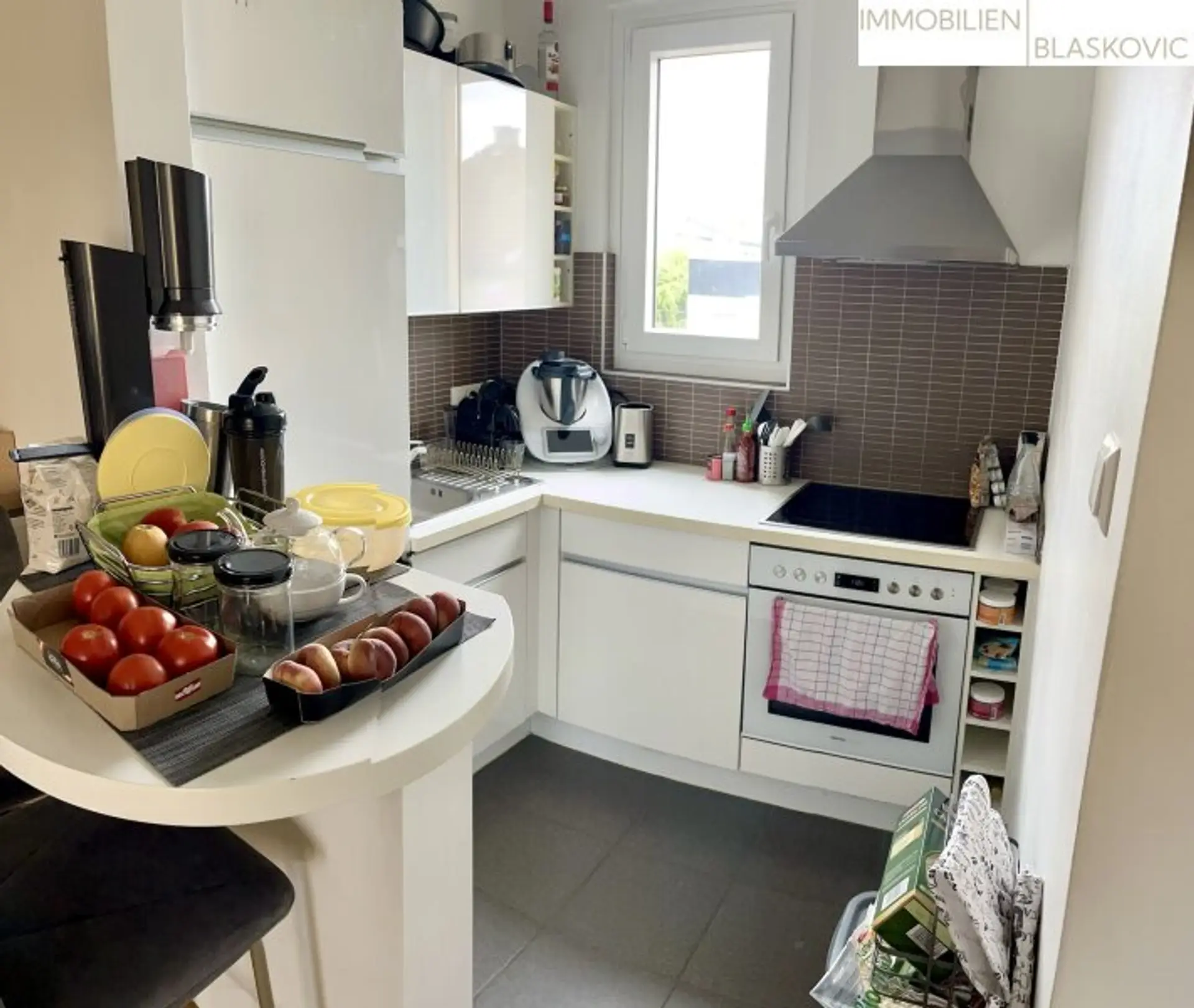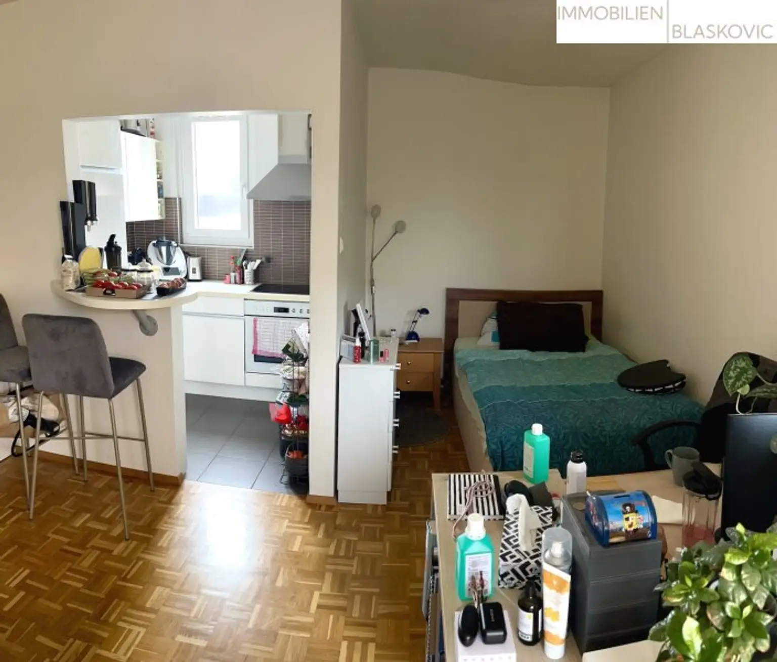 Die Wohnung ist nach Osten ausgerichtet und verfügt über einen kleinen Eingangsbereich, eine moderne Küche mit Bar (Geschirrspüler, Backrohr, Ceran-Kochfeld) die mittels Fenster auch belüftet werden kann. Der Wohnbereich ist so konstruiert, dass neben einem Sofa, Kasten und Schreibtisch auch ein Bett problemlos Platz findet.
