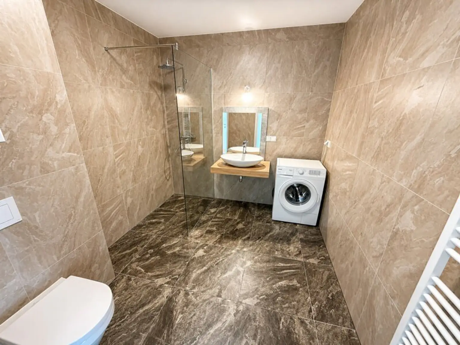 Bathroom with shower, washbasin, toilet, and washing machine connection