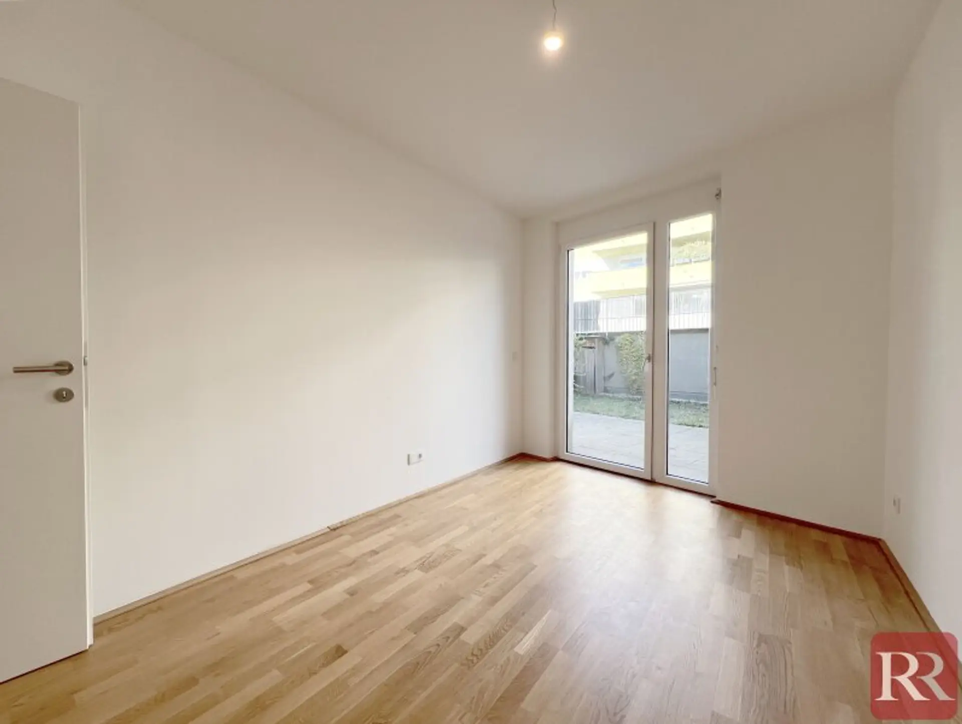 Die beiden Schlafzimmer führen in den ruhig gelegenen Nordgarten inklusive Terrasse mit ca. 39,8 m² Fläche und dem zweiten Eigengarten.