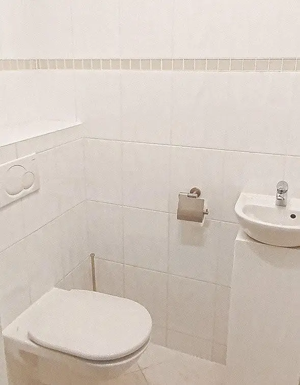 Das schicke Badezimmer ist mit Waschtisch inkl. XL Waschbecken und Hans Grohe Armaturen und Handtuchschrank sowie XL Badewanne mit Handbrause und faltbarer Glas-Duschwand sowie Schrank für Waschmaschine und Trockner ausgestatt und ein extra WC mit Waschtisch ergänzt den Komfort.