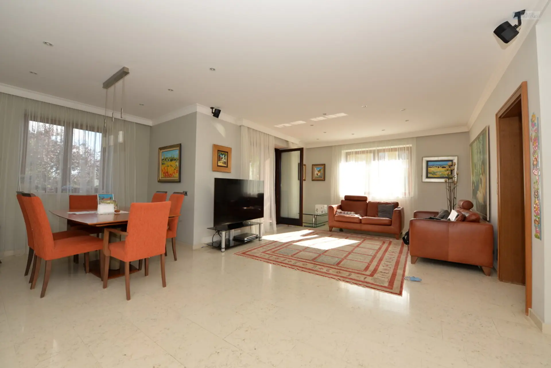 •Wohnsalon mit Couchgruppe, Essbereich und Ausgang auf Loggia / Balkon