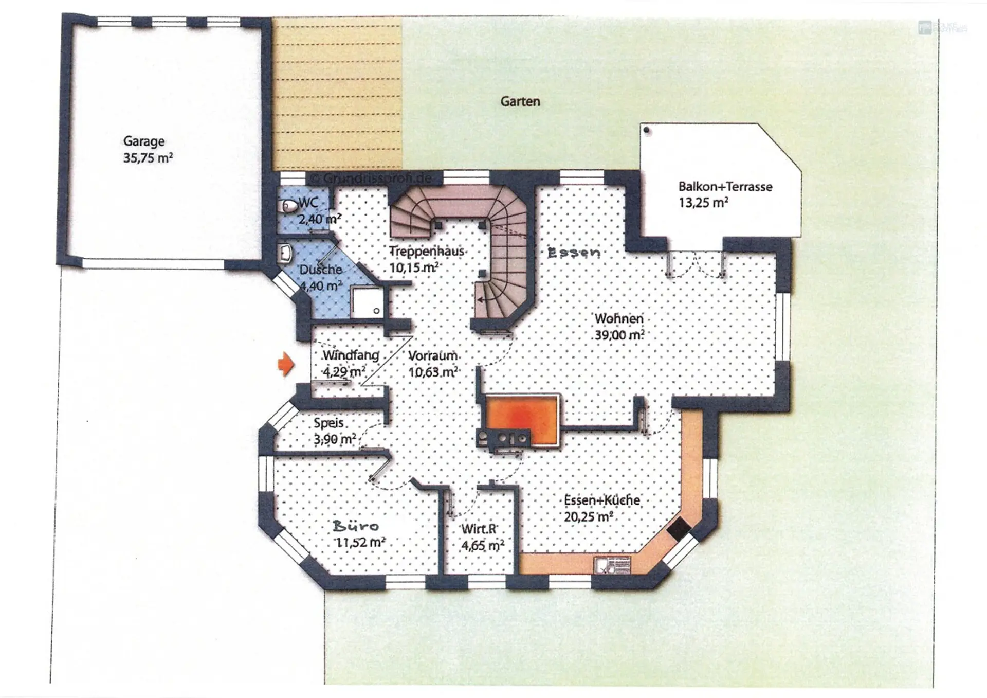 An das Wohngebäude mit einer Wohnnutzfläche von rund 366m² schliesst eine Doppelgarage mit rund 37m² und vorgelagertem Carport an.