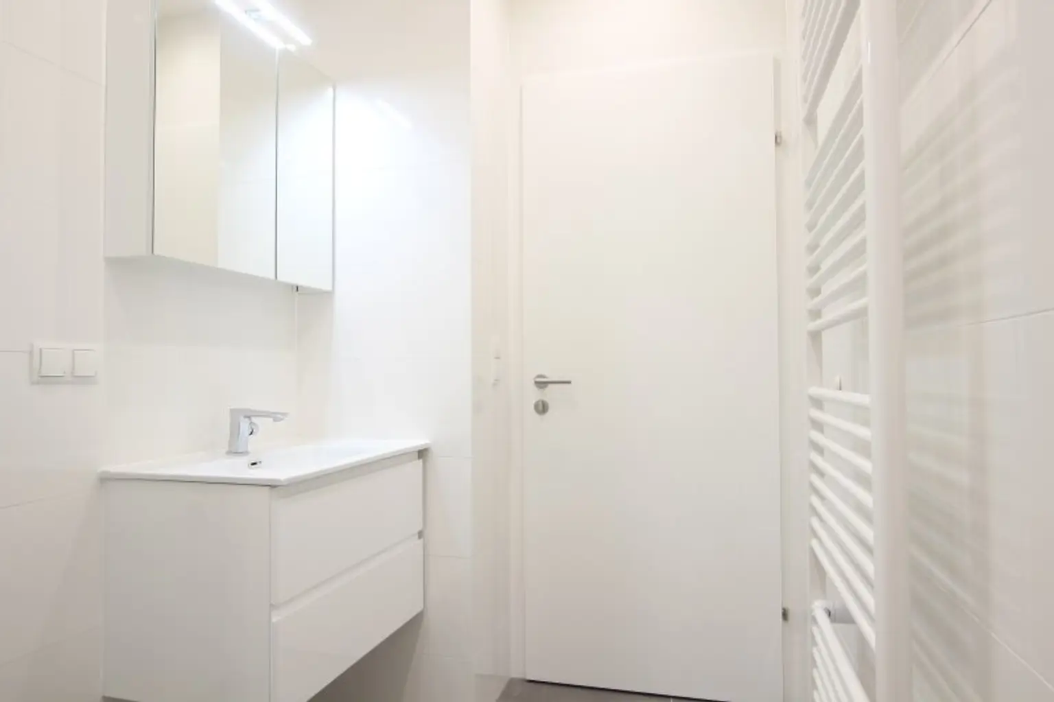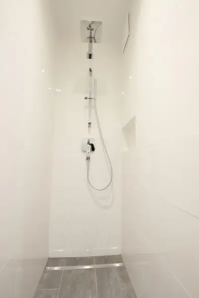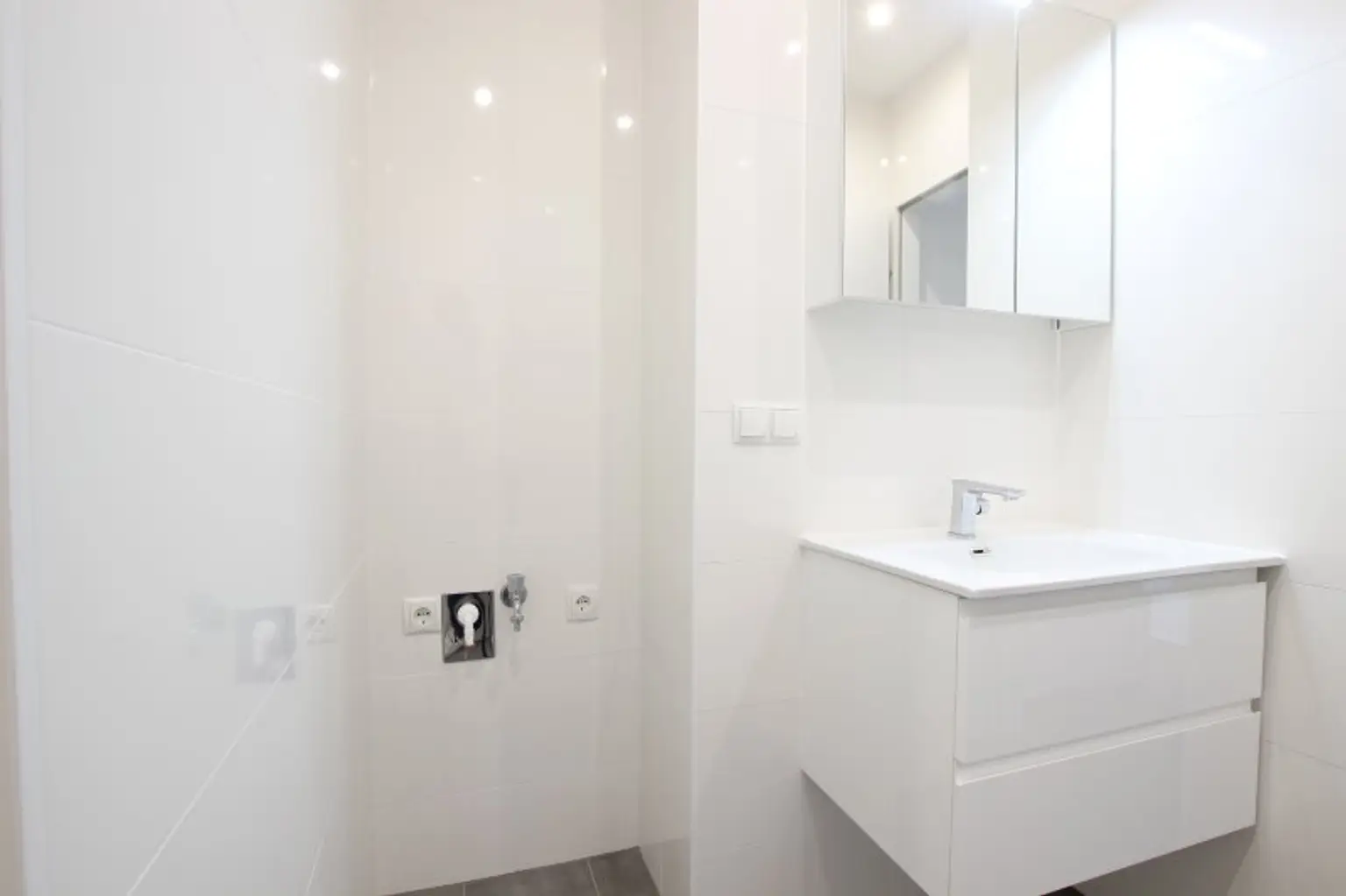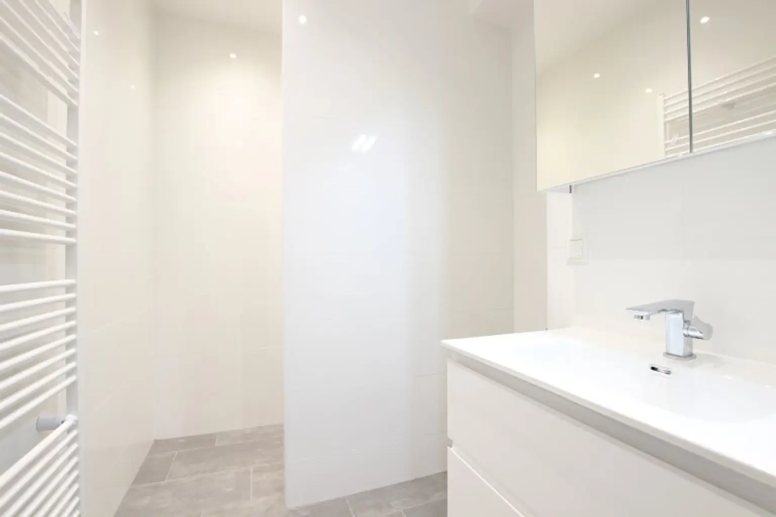 Das Badezimmer ist mit einer modernen Walk-In Dusche mit Edelstahl-Abflussrinne, Handtuchheizkörper und Waschmaschinenanschluss ausgestattet. Außerdem sorgt ein attraktiver Waschtisch und Spiegelschrank für Styling im Badezimmer. Viel Stauraum bietet ein praktischer Abstellraum.