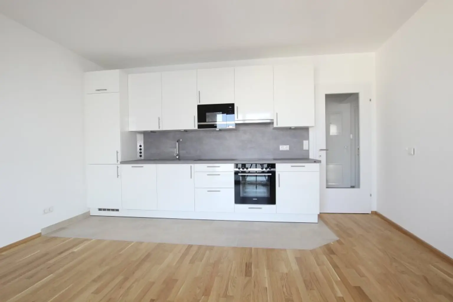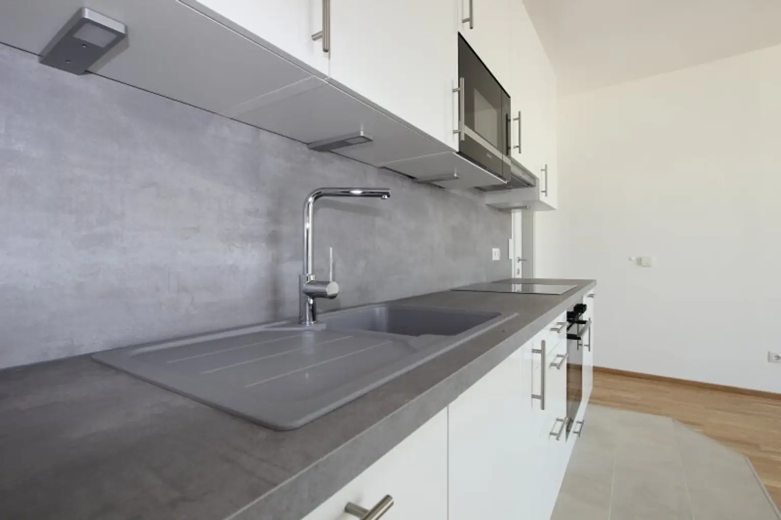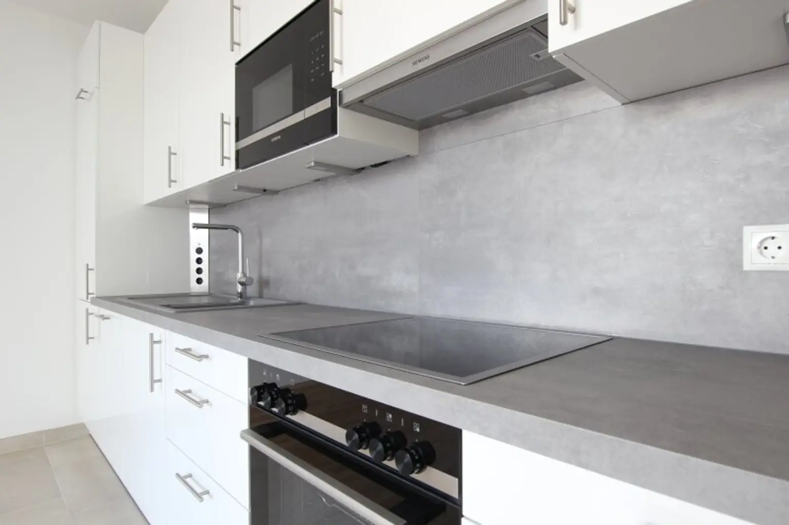 Eine elegante EWE-Einbauküche (weiße Fronten), mit Siemens Geräten, inkl. Einbau-Edelstahl-Mikrowelle und Geschirrspüler lässt keine Wünsche offen.