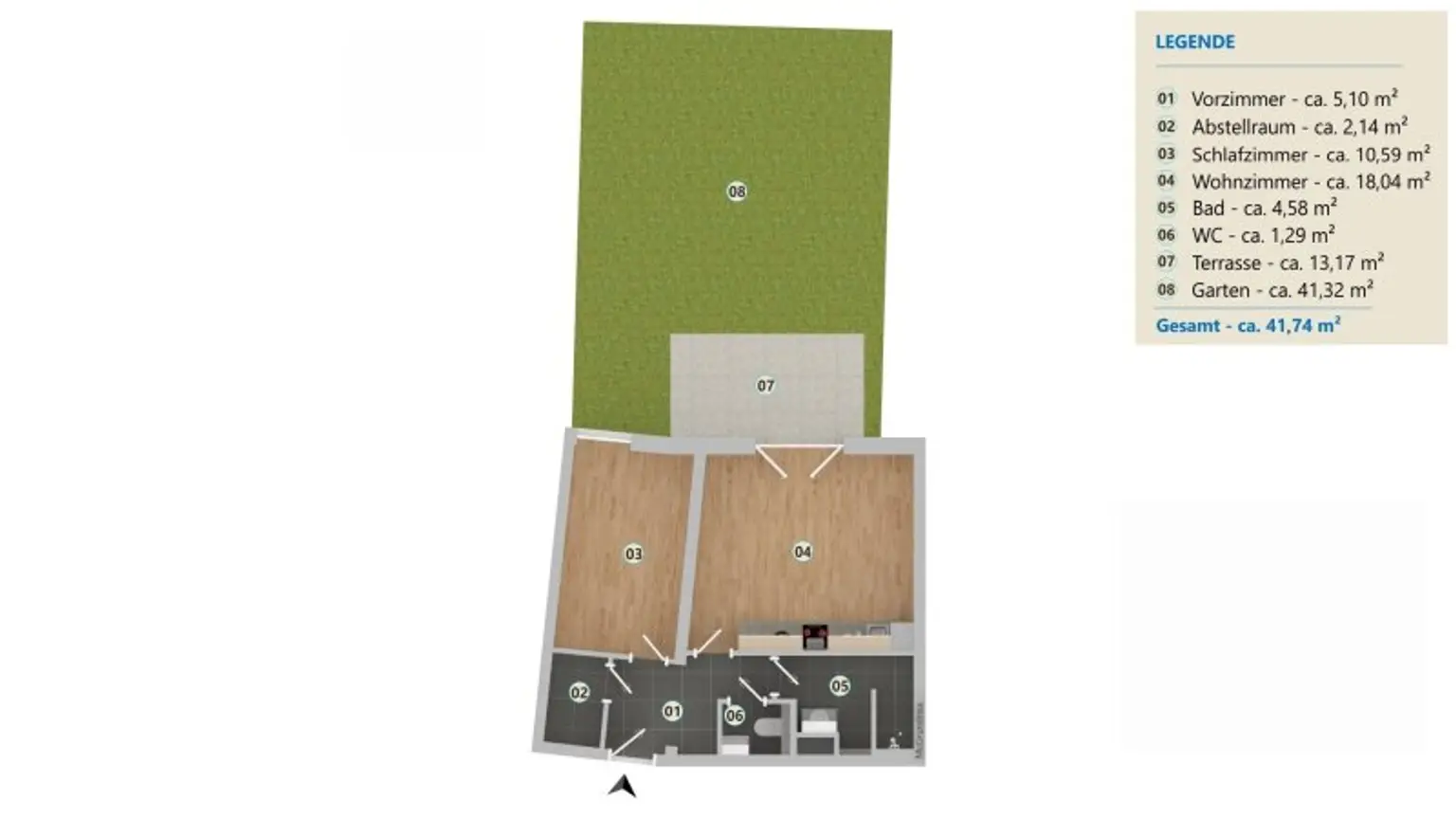Bestlage im Zentrum Korneuburgs: Diese moderne, im ruhigen Innenhof gelegene 2-Zimmer-Gartenwohnung, Baujahr 2021, bietet alle Annehmlichkeiten einer Stadtwohnung. Im Garten (ca. 54,5m²) befindet sich eine schöne, westseitig ausgerichtete Terrasse (ca. 13,2m²).
