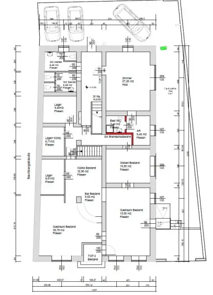 Gewerbefläche von ca. 120m² - WC-Anlagen für Damen und Herren jeweils ca. 7m² - eine Freifläche (Gastgarten)