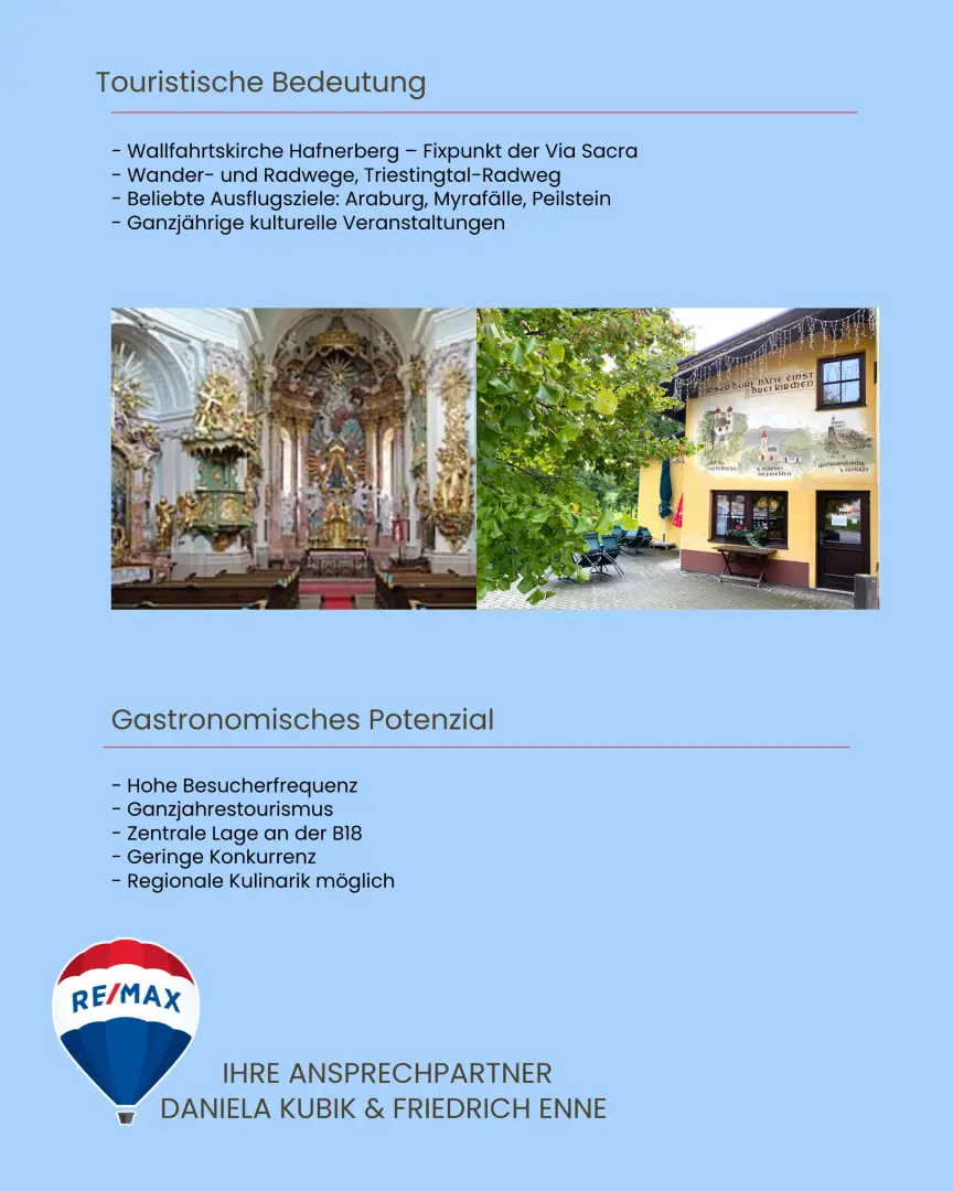 Der Hafnerberg in der Gemeinde Altenmarkt an der Triesting bietet eine herausragende Kombination aus kultureller Tradition, landschaftlicher Schönheit und touristischer Frequentierung. Ein Gastronomiebetrieb an diesem Standort hätte ideale Voraussetzungen, um sich nachhaltig als beliebtes Ausflugsziel und kulinarischer Treffpunkt zu etablieren.