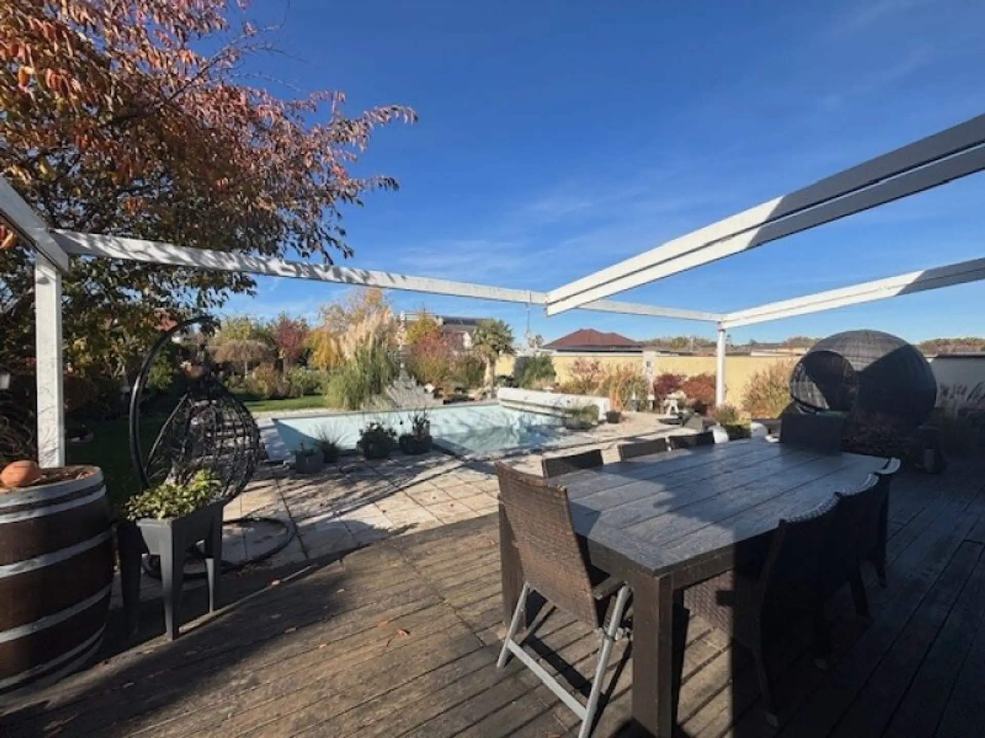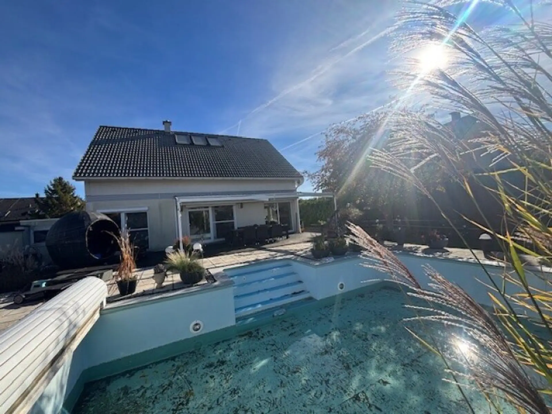 Der großzügige Garten lädt zu unvergesslichen Momenten im Freien ein. Genießen Sie die warmen Sommerabende auf der Terrasse, während Sie den herrlichen Grünblick über die Umgebung bewundern. Hier können Sie entspannen, spielen oder einfach die Natur in vollen Zügen genießen. Der große an den Terrassenbereich angrenzende Pool spendet angenehme Abkühlung an heißen Sommertagen und kann aufgrund der Solarplane bis in den Herbst hinein genutzt werden.. Wohnen Sie, wo andere urlauben!