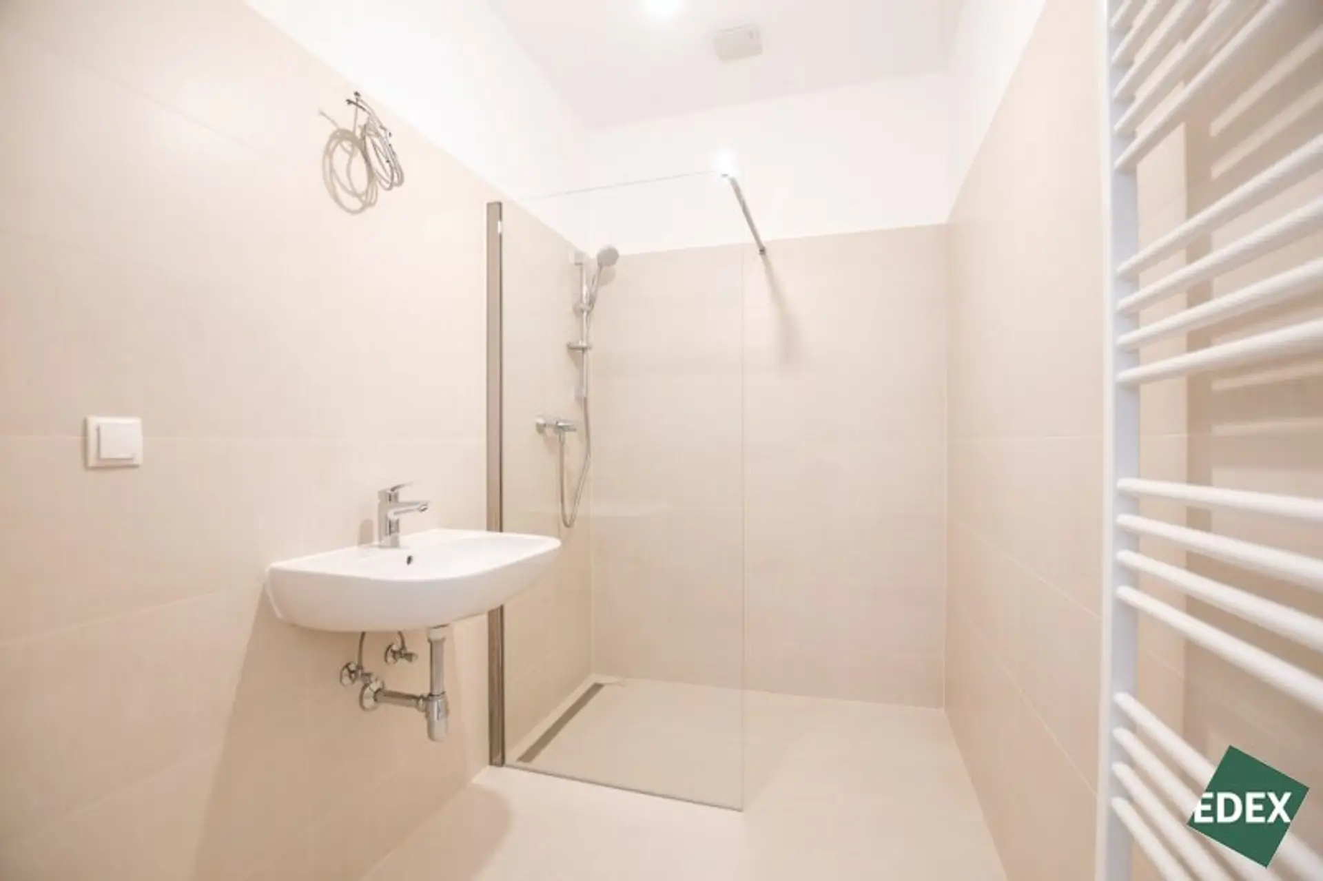 Badezimmer mit Dusche und Waschmaschinenanschluss