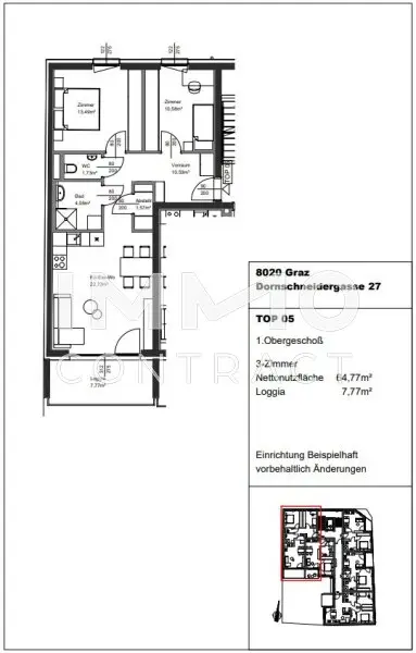 Diese ca. 64,77 m² große, geförderter 3 Zimmer-Wohnung befindet sich im 1. Obergeschoß des Hauses Dornschneidergasse 27 in einem modernen, neuwertigen Wohnhaus.