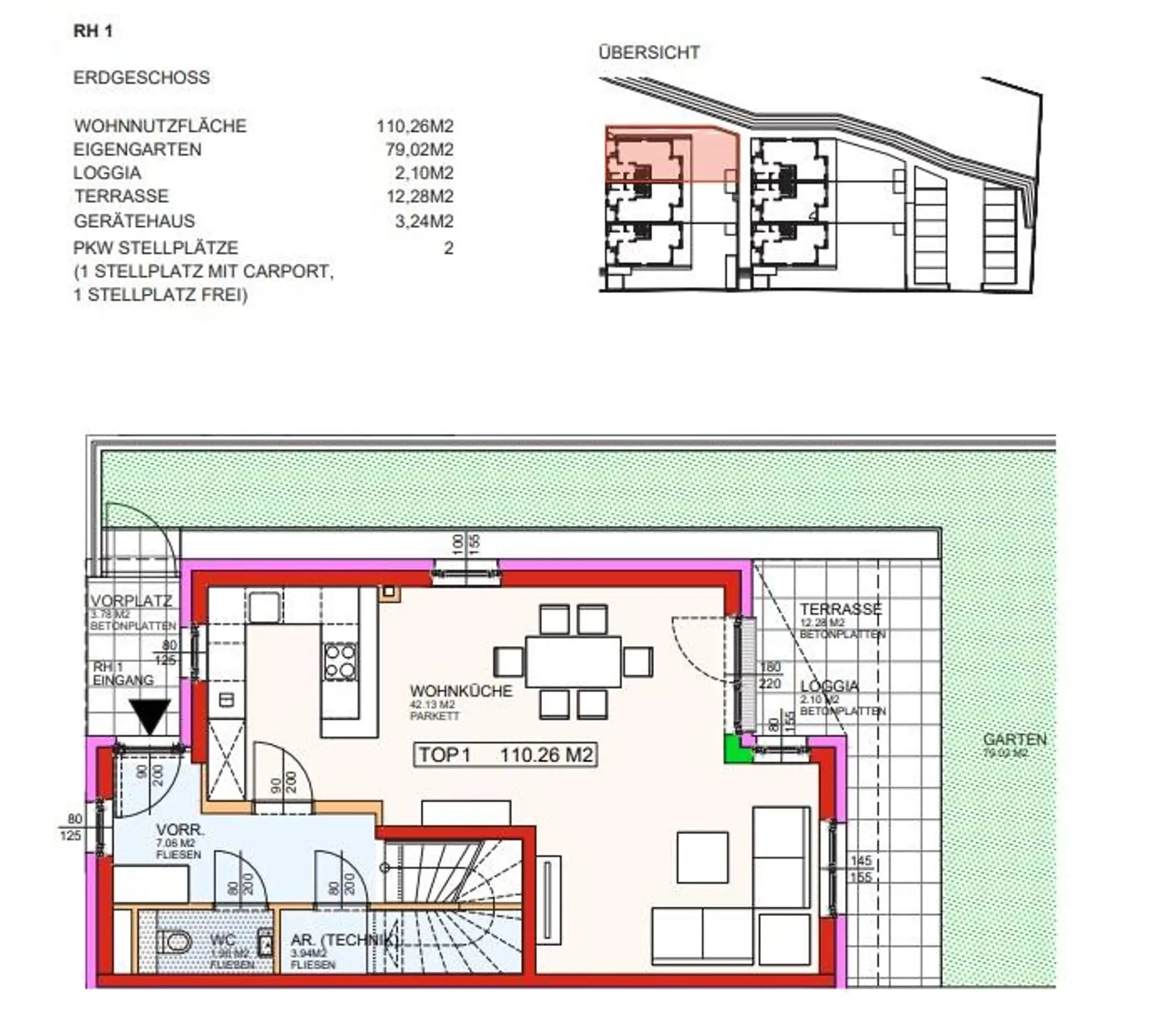 > jedem Reihenhaus wird im Freien ein zusätzlicher Autoabstellplatz zugeordnet