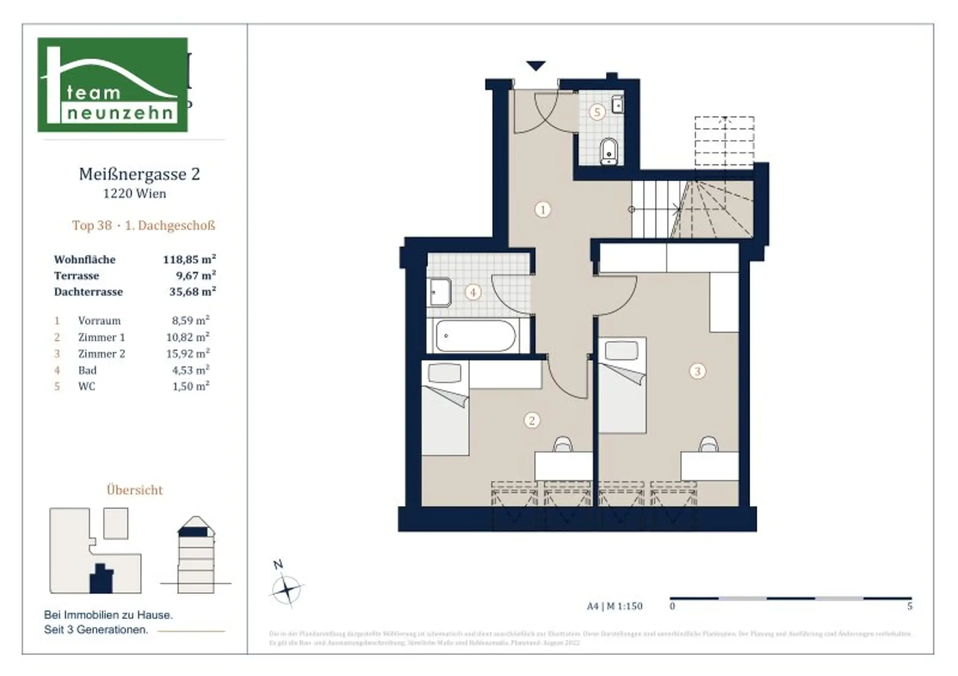 Die 4-Zimmer Wohnung mit ca. 118,85 m² Wohnfläche zzgl. ca. 9,67 m² Terrasse und ca. 35,68 m² Dachterrasse liegt im 1.-2. Dachgeschoss und gliedert sich in folgende Raumaufteilung: