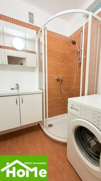 * modernes Badezimmer mit Runddusche und Waschmaschine