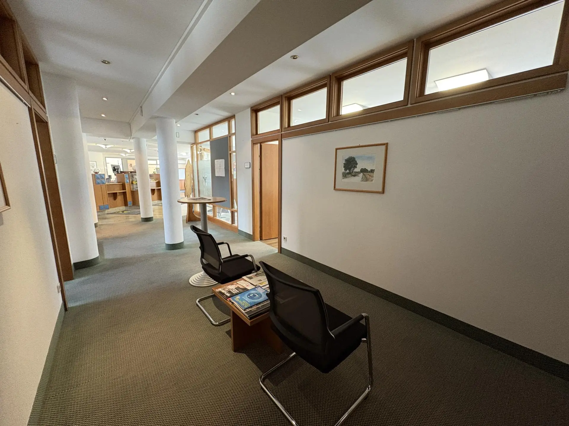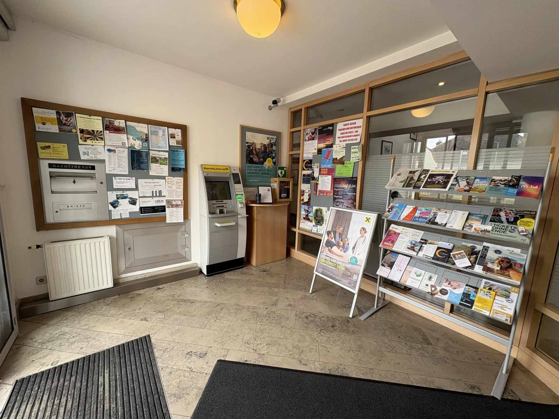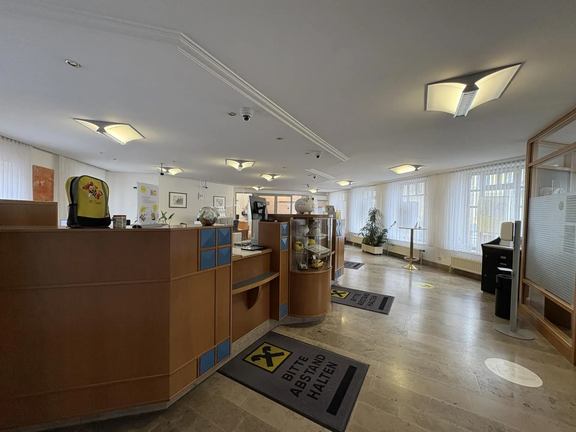 Im Erdgeschoss begrüßen Sie ein helles Foyer, der großzügige Schalterraum sowie mehrere Büro-, Sanitär- und Lagerräume. Massive Stiegenanlagen führen in das Ober- sowie in das Kellergeschoss.