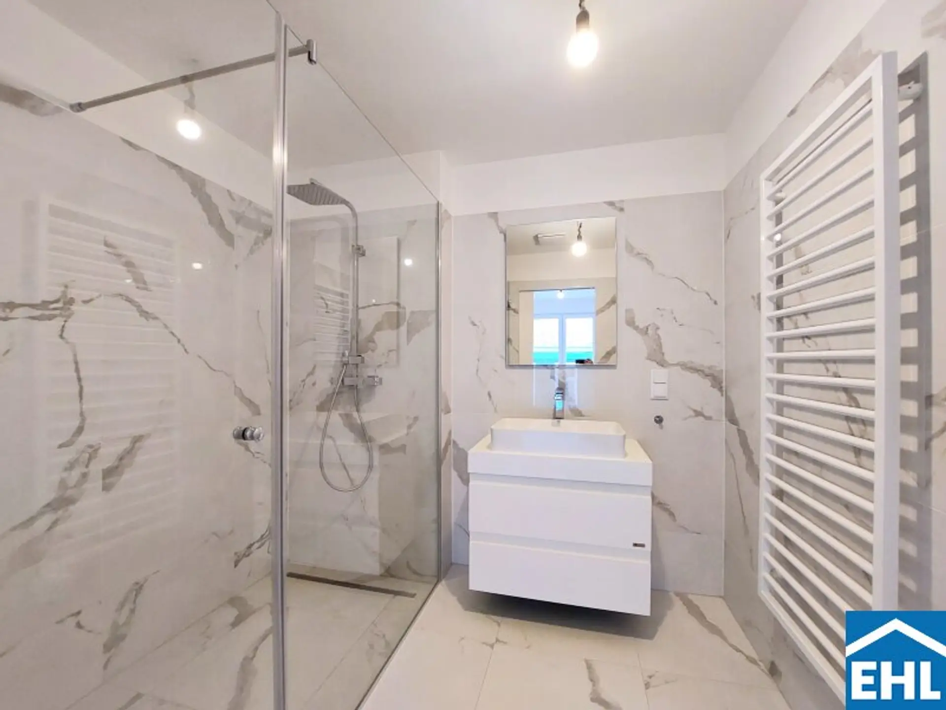 * moderne Bäder mit Walk-In-Duschen, Regendusche und elektrisch bedienbare Sprossenheizkörper