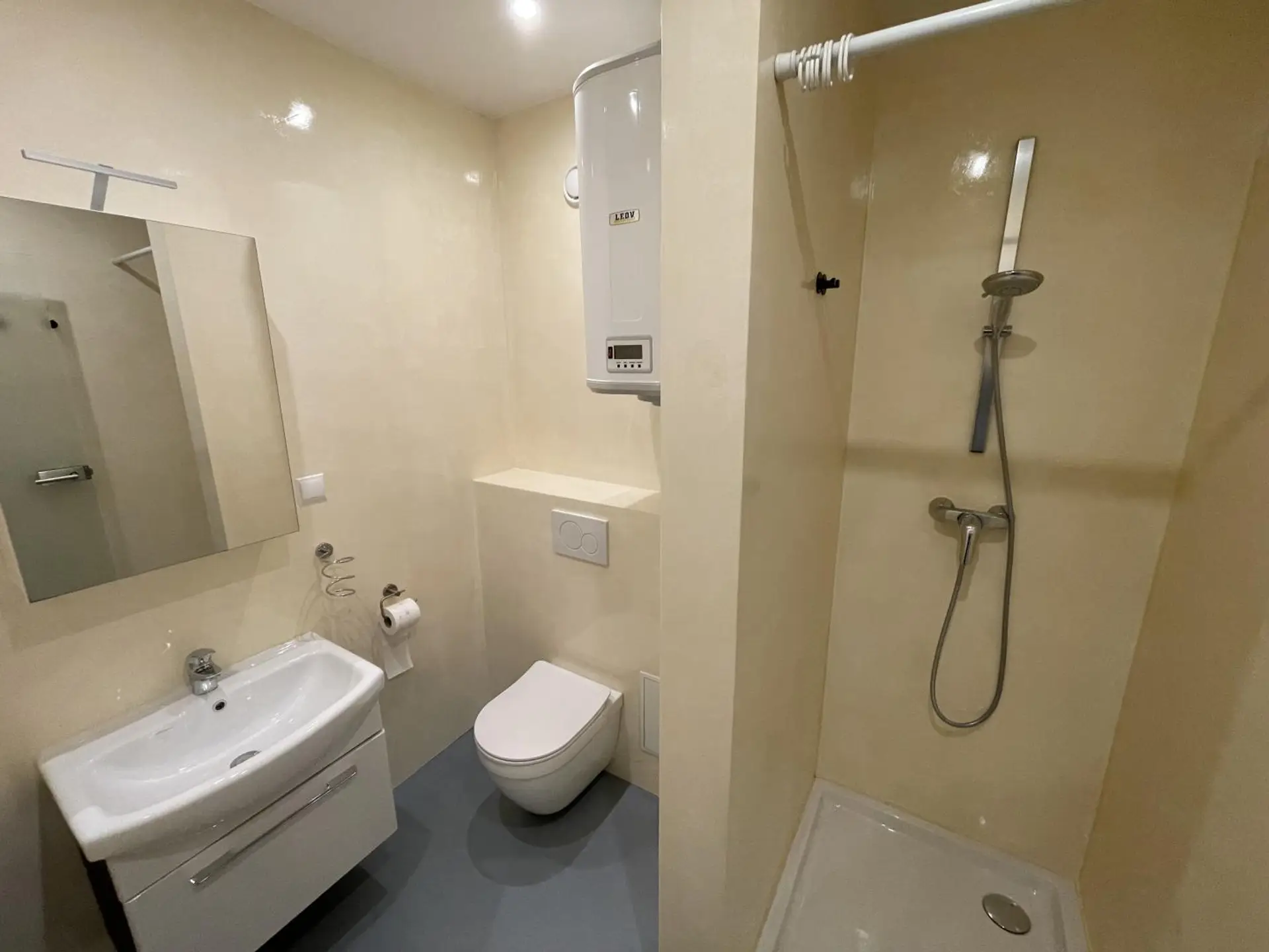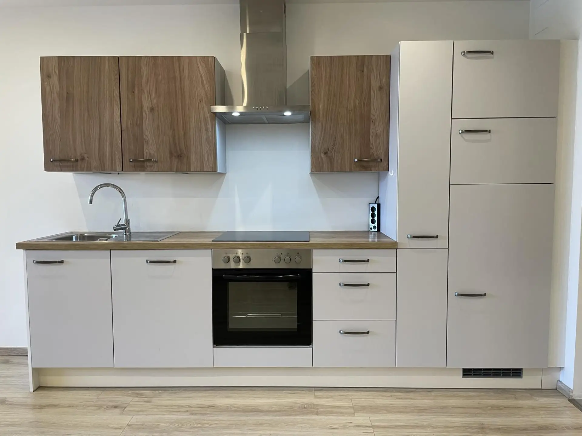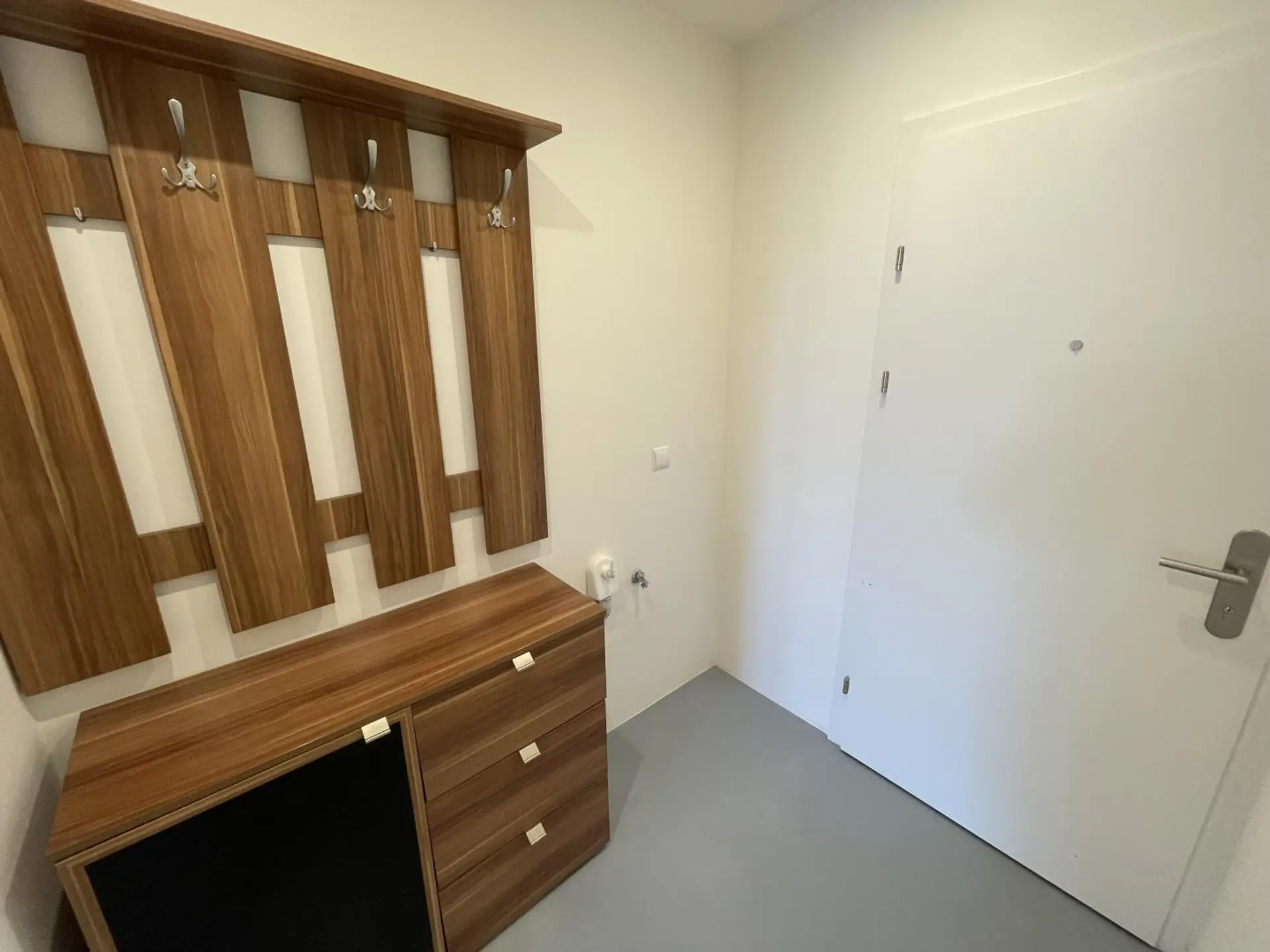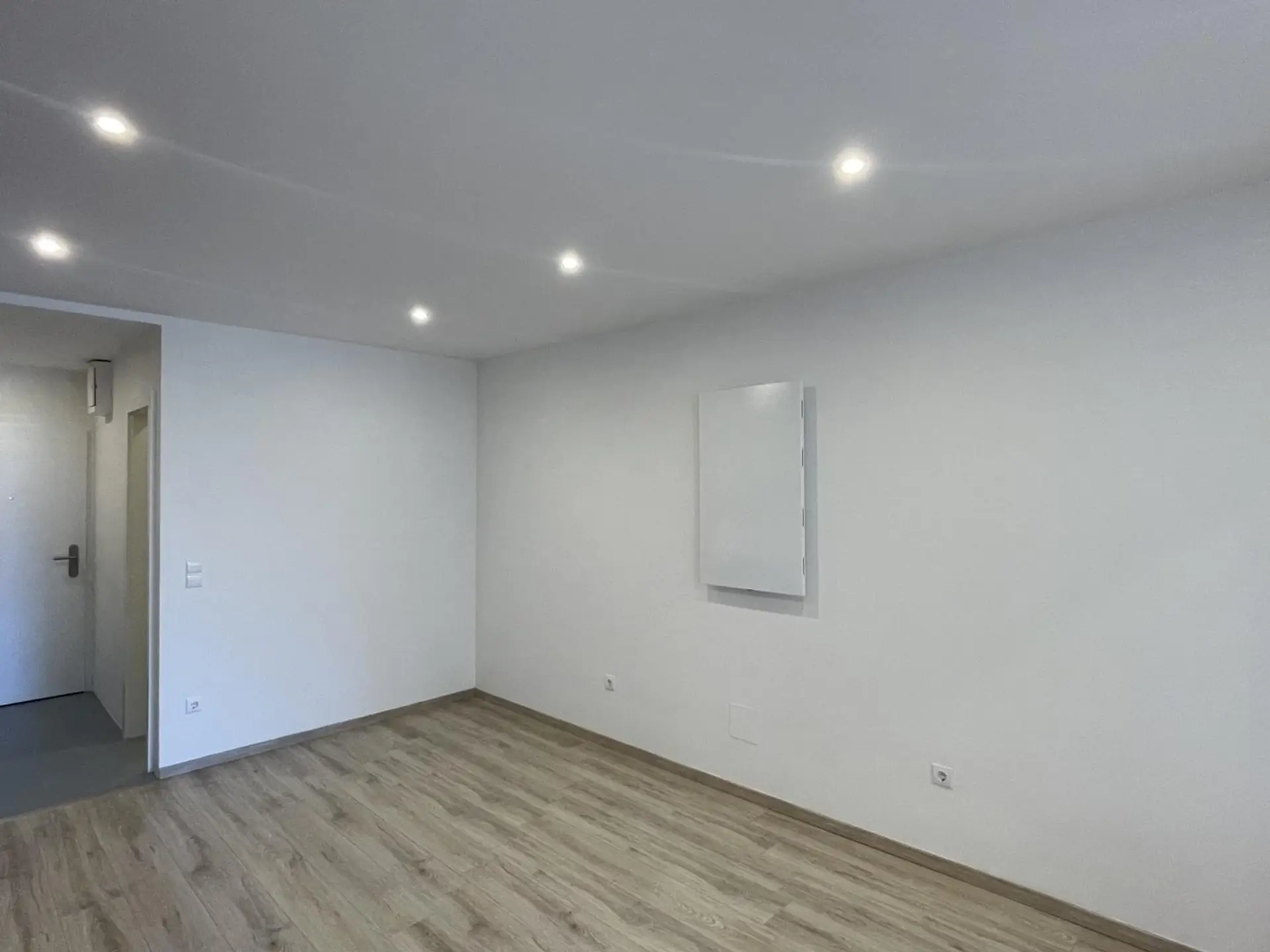 Beim Betreten der Wohnung empfängt Sie ein kleiner Vorraum, der in den großzügigen, lichtdurchfluteten Koch-/Wohn-/Schlafbereich mit Zugang zur Loggia führt. Der Raum ist mit Parkettboden ausgestattet und besticht durch seine offene Gestaltung auf zwei Ebenen. Die im Jahr 2020 neu eingebaute, voll ausgestattete Küche fügt sich harmonisch in das moderne Gesamtbild ein. Auch das Badezimmer wurde vollständig erneuert und ist mit Dusche, WC und einem fugenlosen Gussboden ausgestattet.