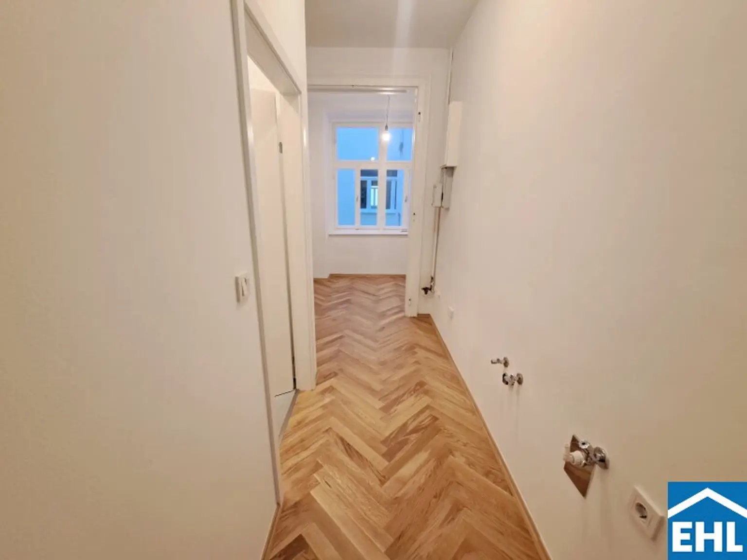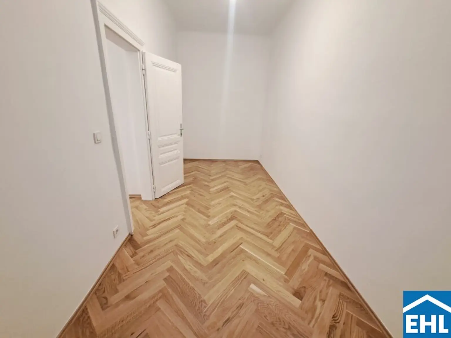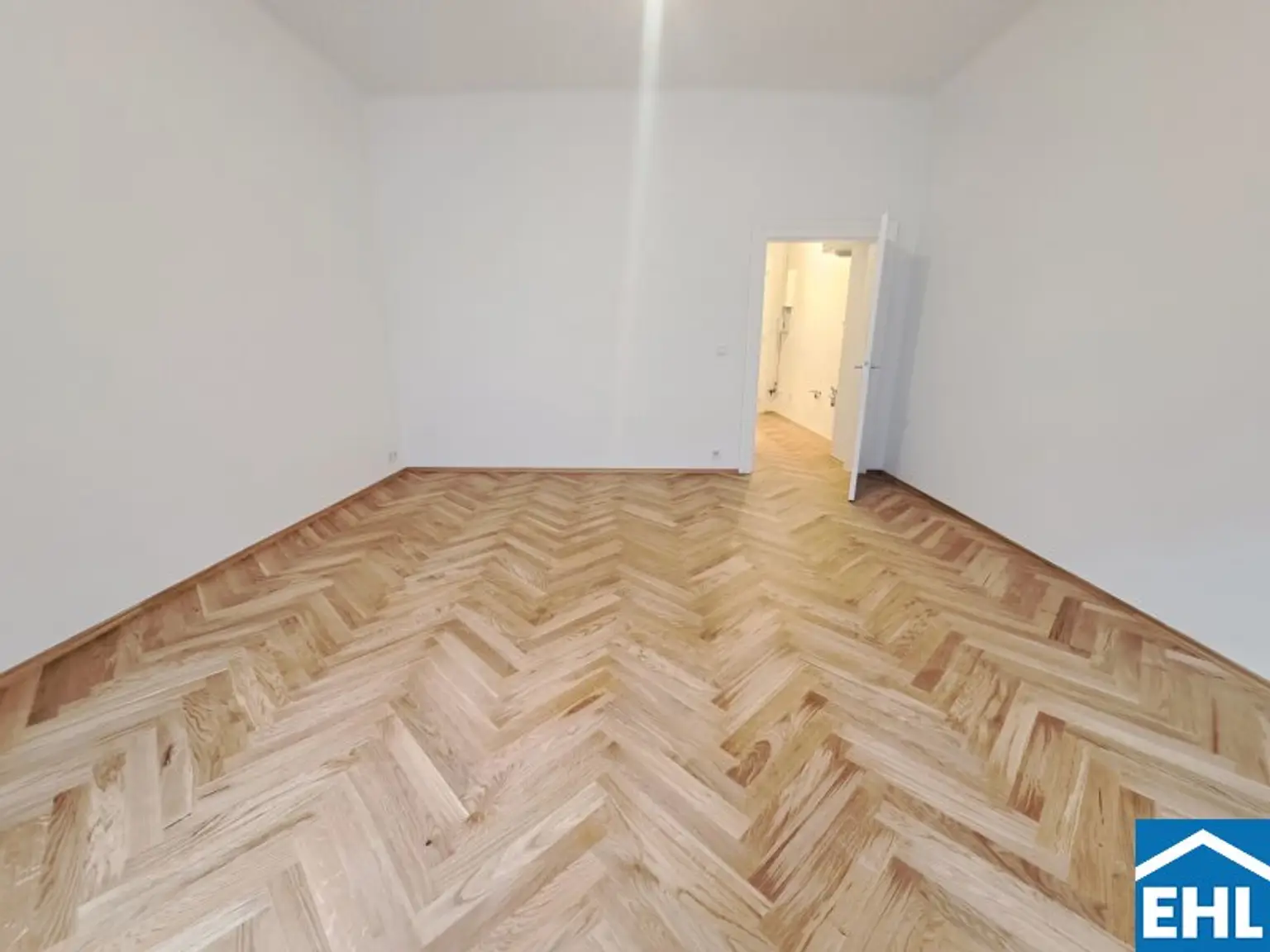 Kürzlich wurden in der gesamten Wohnung (ausgenommen Nassbereiche) die Bodenbeläge ausgetauscht. So verleiht der neue Fischgrätparkettboden der Wohnung eine besondere Wohnatmosphäre.
