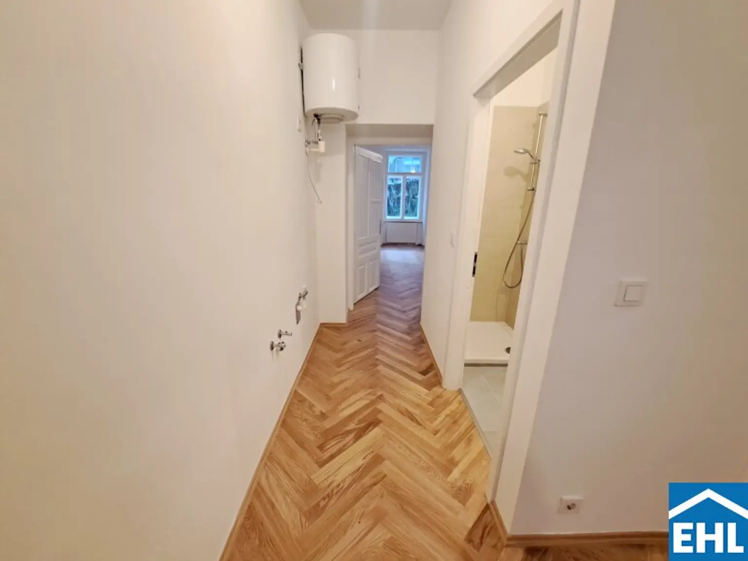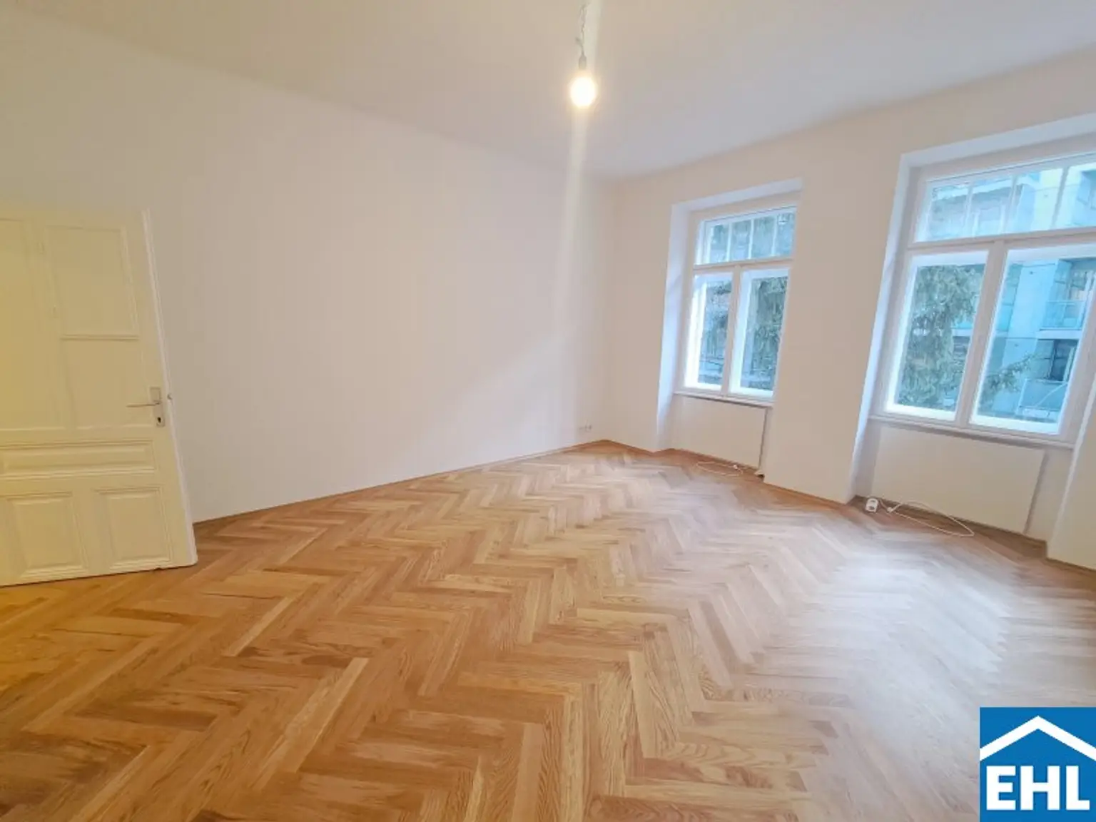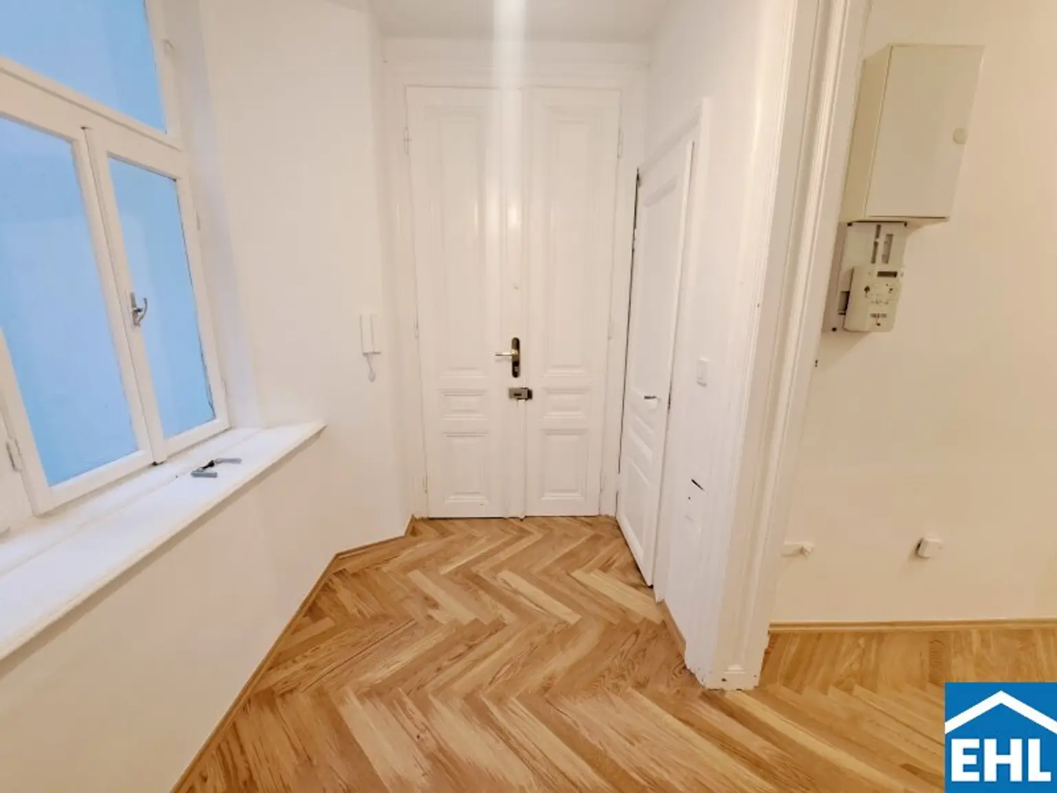 Kürzlich wurden in der gesamten Wohnung (ausgenommen Nassbereiche) die Bodenbeläge ausgetauscht. So verleiht der neue Fischgrätparkettboden der Wohnung eine besondere Wohnatmosphäre.