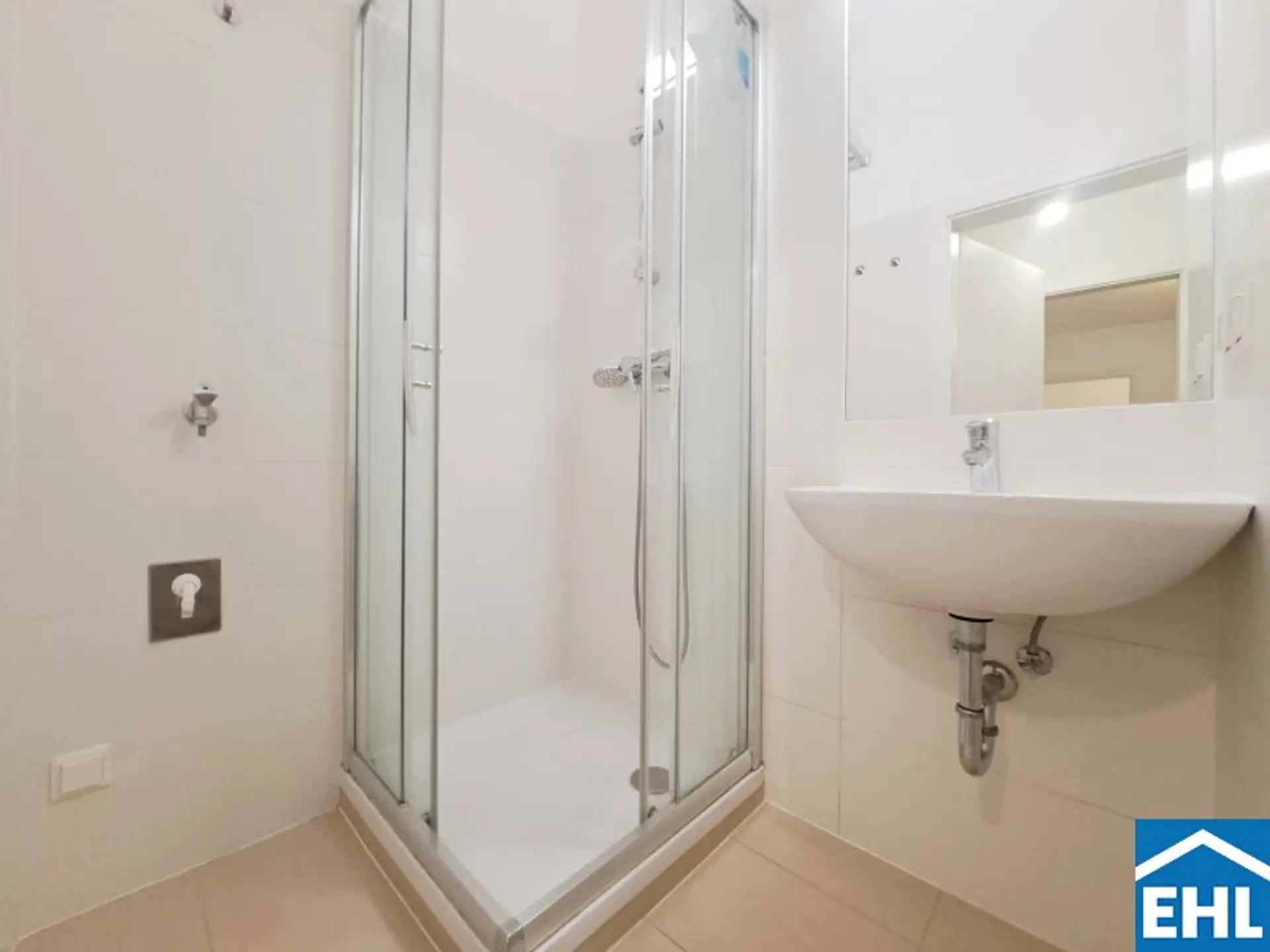 * Badezimmer mit Dusche, WC und Waschmaschinenanschluss