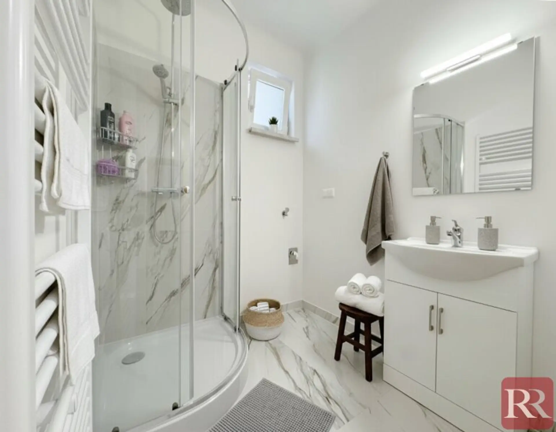 Das Badezimmer hat ein Fenster und ist mit Regenwalddusche, Waschtisch mit Spiegel, Handtuchtrockner und Waschmaschinenanschluss ausgestattet, das WC verfügt ebenfalls über ein Fenster und einen Radiator.