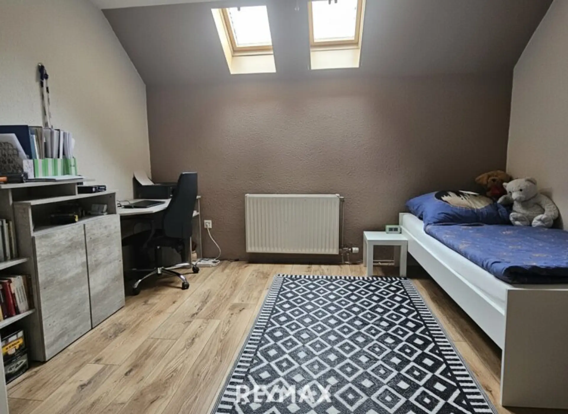 Im Obergeschoß befindet sich ein weiteres Badezimmer, das Schlafzimmer mit Schrank- oder Fitnessraum, 2 Kinderzimmer (eins davon mit Durchgangszimmer).