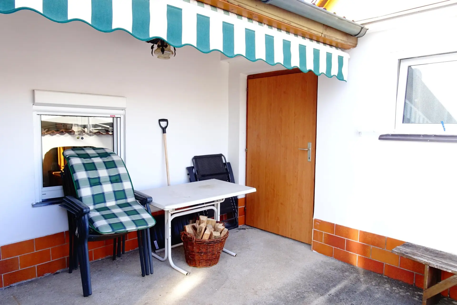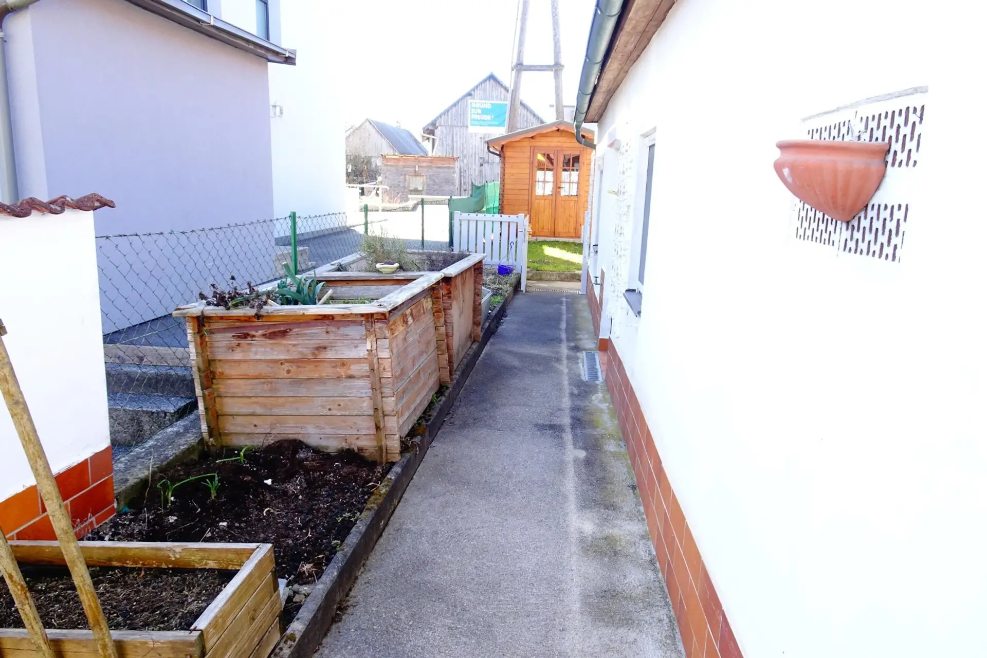Der ca. 100 m² große Garten mit Hochbeeten, Strauchbewuchs und Blumen lädt ebenso zum Verweilen ein wie die überdachte Terrasse mit Markise oder das gemütliche Gartenhaus – ideal zum Grillen und Entspannen.